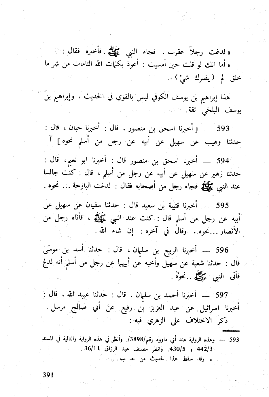 594 - أخبرنَا اسحق بن مَنْصُور قَالَ أخبرنَا أَبُو نعيم قَالَ حَدثنَا زُهَيْر عَن سُهَيْل عَن ابيه عَن رجل من أسلم قَالَ كنت جَالِسا عِنْد النَّبِي صلى الله عَلَيْهِ وَسلم فجَاء رجل من أَصْحَابه فَقَالَ لدغت البارحة نَحوه