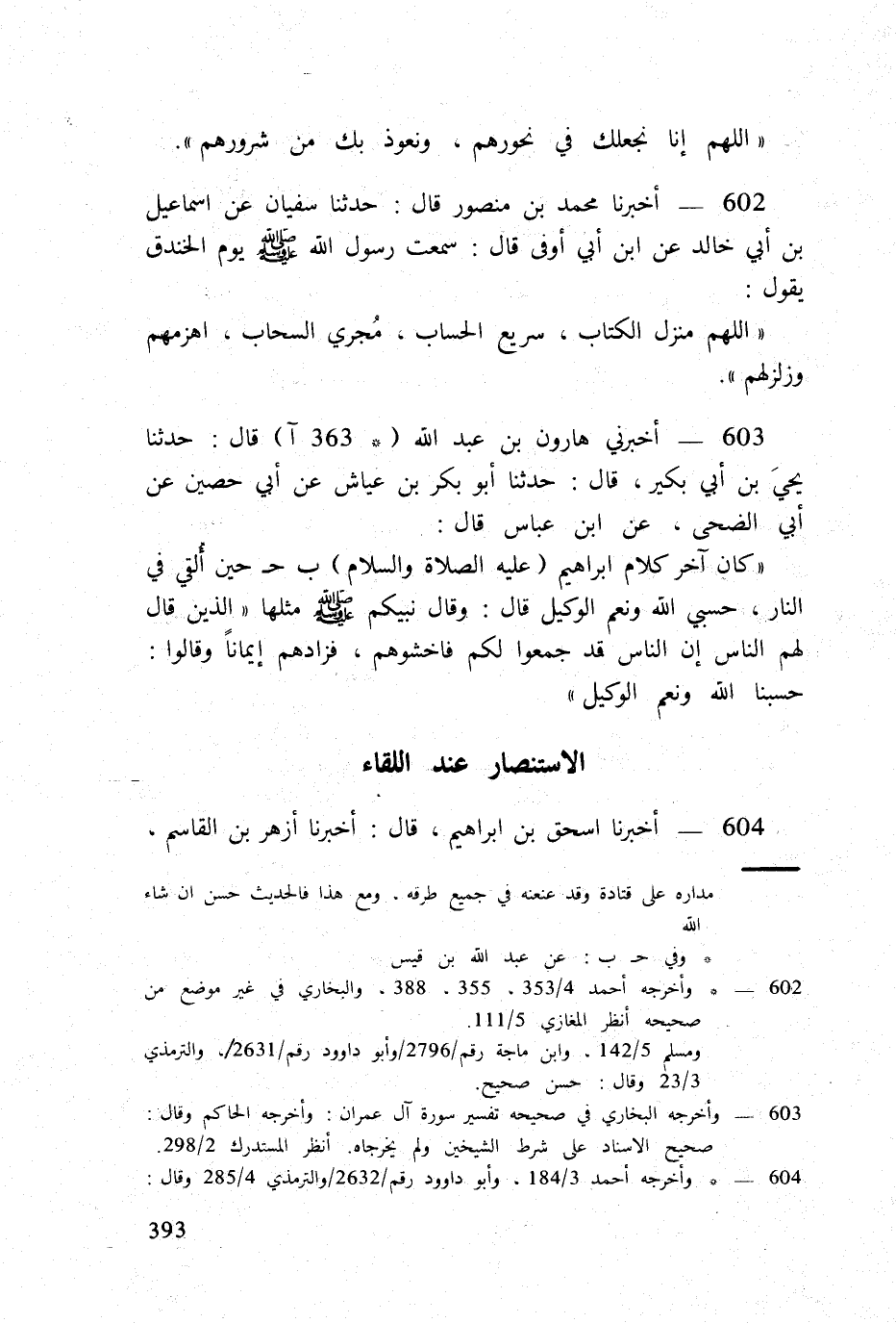 602 - أخبرنَا مُحَمَّد بن مَنْصُور قَالَ حَدثنَا سُفْيَان عَن اسماعيل بن أبي خَالِد عَن ابْن أبي أوفى قَالَ سَمِعت رَسُول الله صلى الله عَلَيْهِ وَسلم يَوْم الخَنْدَق يَقُول