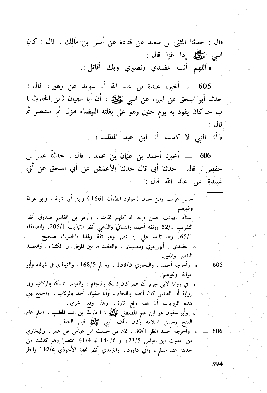 605 - أخبرنَا عَبدة بن عبد الله أَنا سُوَيْد عَن زُهَيْر قَالَ حَدثنَا أَبُو اسحق عَن الْبَراء عَن النَّبِي صلى الله عَلَيْهِ وَسلم أَن أَبَا سُفْيَان (بن الْحَارِث) ب ح كَانَ يَقُود بِهِ يَوْم حنين وَهُوَ على بغلته الْبَيْضَاء فَنزل ثمَّ استنصر ثمَّ قَالَ