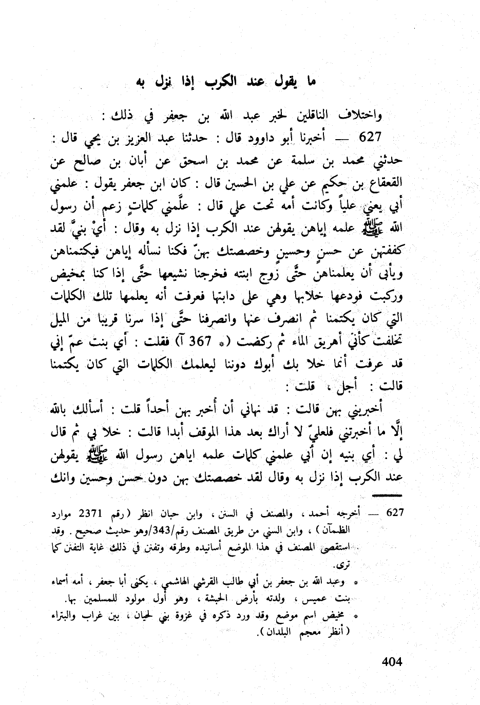 627 - أخبرنَا أَبُو دَاوُود قَالَ حَدثنَا عبد الْعَزِيز بن يحيى قَالَ حَدثنِي مُحَمَّد بن سَلمَة عَن مُحَمَّد بن اسحق عَن ابان بن صَالح عَن الْقَعْقَاع بن حَكِيم عَن عَليّ بن الْحُسَيْن قَالَ كَانَ ابْن جَعْفَر يَقُول عَلمنِي أبي يَعْنِي عليا وَكَانَت أمه تَحت عَليّ قَالَ علَّمني كلماتٍ زعم أَن رَسُول الله صلى الله عَلَيْهِ وَسلم علمه إياهن يقولهن عِنْد الكرب إِذا نزل بِهِ وَقَالَ أَي بنيَّ لقد كففتهن عَن حسنٍ وحسينٍ وخصصتك بهنَّ فَكُنَّا نَسْأَلهُ إياهن فيكتمناهن ويأبى أَن يعلمناهن حتَّى زوج ابْنَته فخرجنا نشيعها حتَّى إِذا كُنَّا بمخيض وَركبت فودعها خلابها وَهِي على دابتها فَعرفت أَنه يعلمهَا تِلْكَ الْكَلِمَات الَّتِي كَانَ يكتمنا ثمَّ انْصَرف عَنْهَا وانصرفنا حتَّى إِذا سرنا قَرِيبا من الْميل تخلفت كَأَنِّي أهريق المَاء ثمَّ ركضت (367 آ) فَقلت أَي بنت عمّ إِنِّي قد عرفت أَنما خلا بك أَبوك دُوننَا ليعلمك الْكَلِمَات الَّتِي كَانَ يكتمنا قَالَت أجل قلت