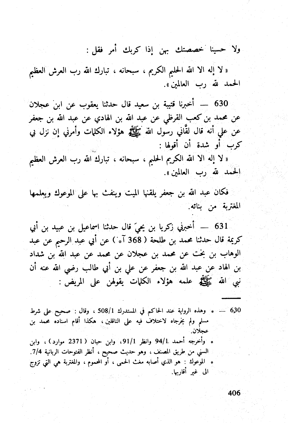 630 - أخبرنَا قُتَيْبَة بن سعيد قَالَ حَدثنَا يَعْقُوب عَن ابْن عجلَان عَن مُحَمَّد بن كَعْب الْقرظِيّ عَن عبد الله بن الْهَادِي عَن عبد الله بن جَعْفَر عَن عَليّ أَنه قَالَ لقاني رَسُول الله صلى الله عَلَيْهِ وَسلم هَؤُلَاءِ الْكَلِمَات وَأَمرَنِي إِن نزل بِي كرب أَو شدَّة أَن أقولها