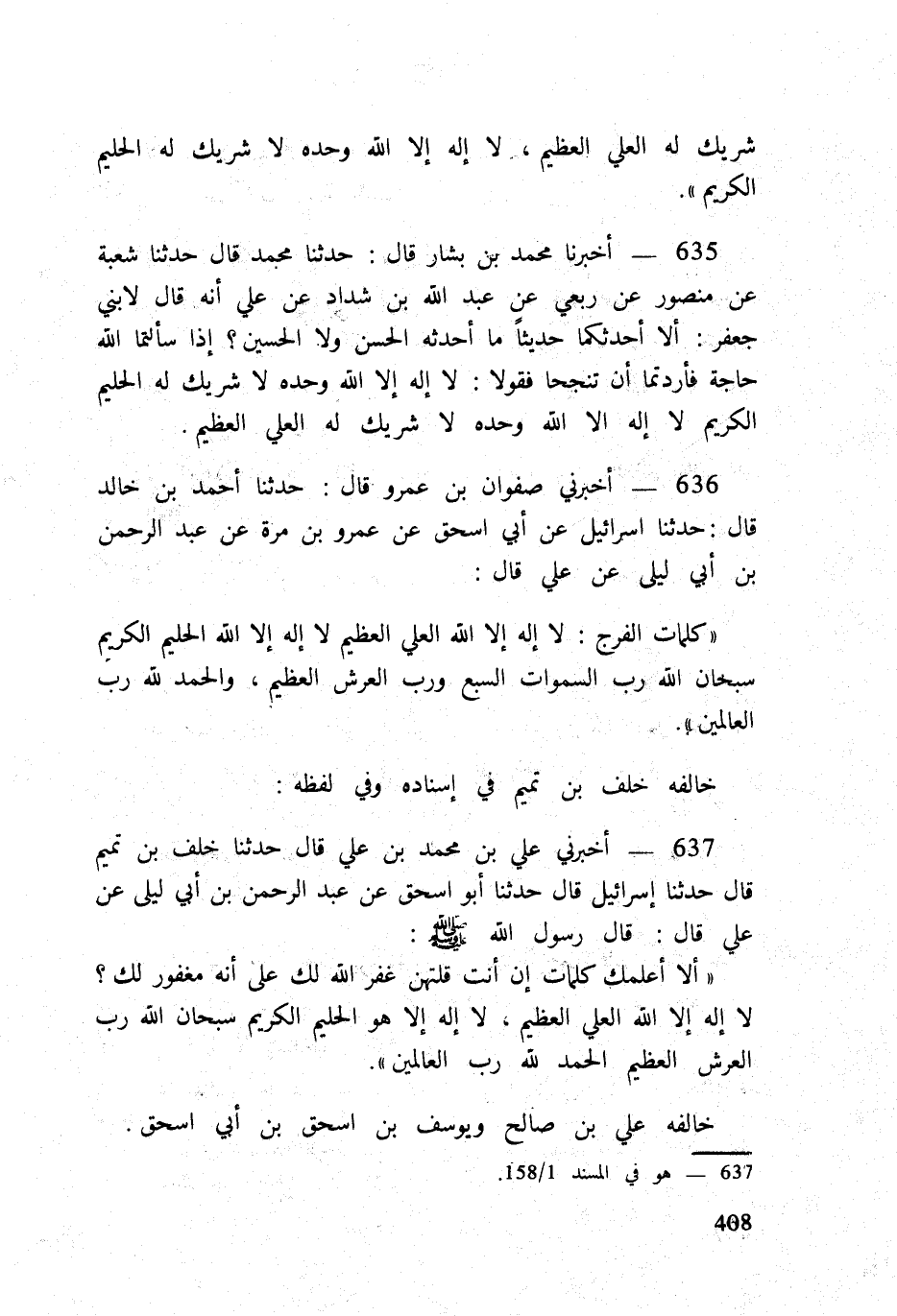 635 - أخبرنَا مُحَمَّد بن بشار قَالَ حَدثنَا مُحَمَّد قَالَ حَدثنَا شُعْبَة عَن مَنْصُور عَن ربعي عَن عبد الله بن شَدَّاد عَن عَليّ أَنه قَالَ لِابْني جَعْفَر أَلا أحدثكما حَدِيثا مَا أحدثه الْحسن وَلَا الْحُسَيْن إِذا سألتما الله حَاجَة فأردتما أَن تنجحا فقولا لَا إِلَه إِلَّا الله وَحده لَا شريك لَهُ الْحَلِيم الْكَرِيم لَا إِلَه إِلَّا الله وَحده لَا شريك لَهُ الْعلي الْعَظِيم