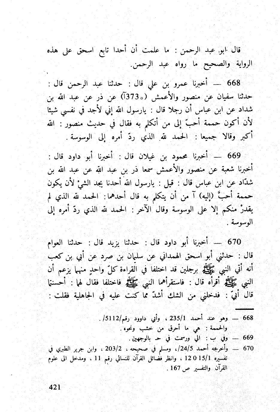 668 - أخبرنَا عَمْرو بن عَليّ قَالَ حَدثنَا عبد الرَّحْمَن قَالَ حَدثنَا سُفْيَان عَن مَنْصُور وَالْأَعْمَش (373 آ) عَن ذَر عَن عبد الله بن شَدَّاد عَن ابْن عَبَّاس أَن رجلا قَالَ يَا رَسُول الله إِنِّي لأجد فِي نَفسِي شَيْئا لِأَن أكون حممه أحب إِلَى من أَتكَلّم بِهِ فَقَالَ فِي حَدِيث مَنْصُور الله أكبر وَقَالا جَمِيعًا الْحَمد لله الَّذِي رد أمره إِلَى الوسوسة