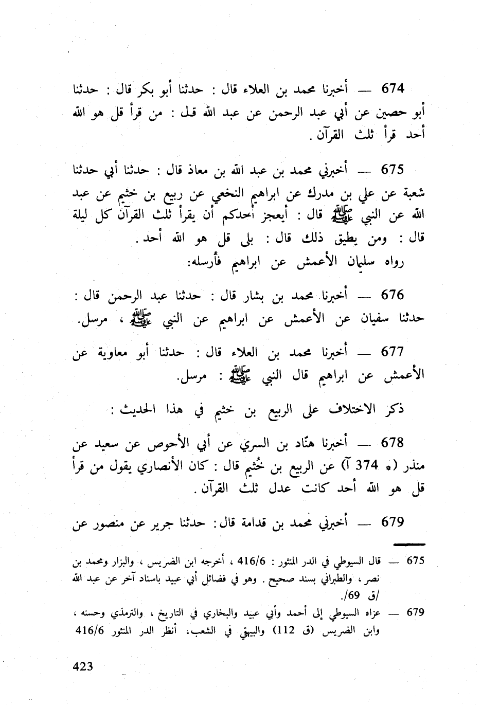 674 - أخبرنَا مُحَمَّد بن الْعَلَاء قَالَ حَدثنَا أَبُو بكر قَالَ حَدثنَا أَبُو حُصَيْن عَن أبي عبد الرَّحْمَن عَن عبد الله قل من قَرَأَ {قل هُوَ الله أحد} قَرَأَ ثلث الْقُرْآن
