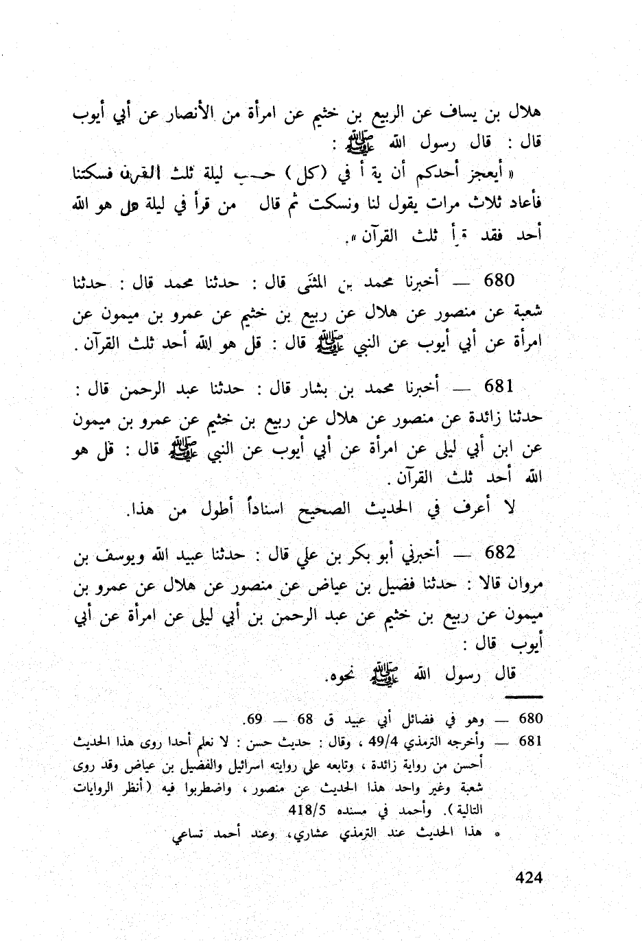 681 - أخبرنَا مُحَمَّد بن بشار قَالَ حَدثنَا عبد الرَّحْمَن قَالَ حَدثنَا زَائِدَة عَن مَنْصُور عَن هِلَال عَن ربيع بن خثيم عَن عَمْرو بن مَيْمُون عَن ابْن أبي ليلى عَن امْرَأَة عَن أبي أَيُّوب عَن النَّبِي صلى الله عَلَيْهِ وَسلم قَالَ {قل هُوَ الله اُحْدُ} ثلث الْقُرْآن