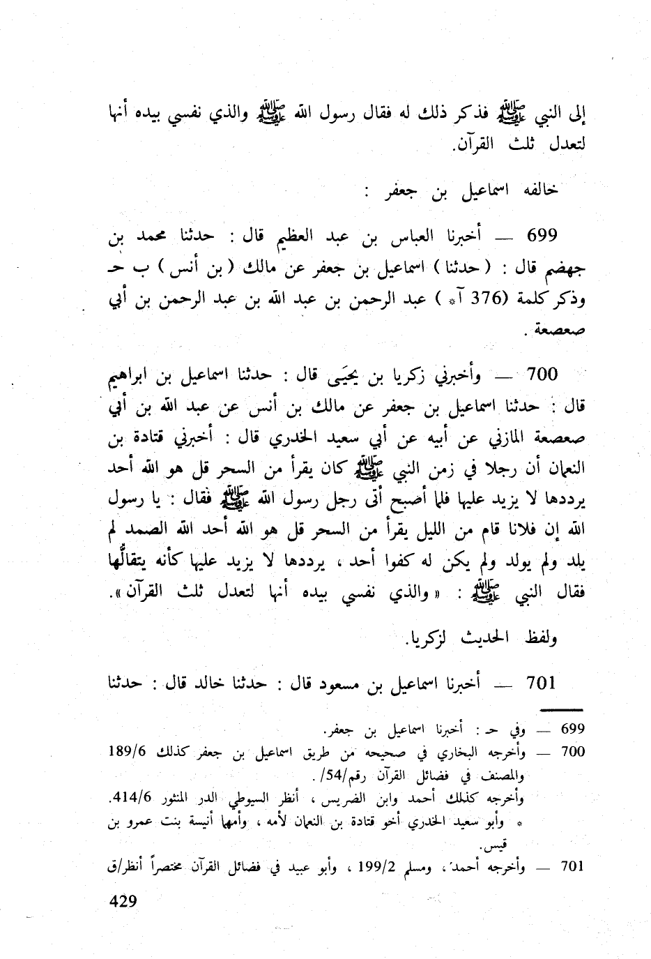 700 - وَأَخْبرنِي زَكَرِيَّا بن يحيى قَالَ حَدثنَا إِسْمَاعِيل بن إِبْرَاهِيم قَالَ حَدثنَا اسماعيل بن جَعْفَر عَن مَالك بن أنس عَن عبد الله بن أبي صعصعة الْمَازِني عَن أَبِيه عَن أبي سعيد الْخُدْرِيّ قَالَ أَخْبرنِي قَتَادَة بن النُّعْمَان أَن رجلا فِي زمن النَّبِي صلى الله عَلَيْهِ وَسلم كَانَ يقْرَأ من السحر {قل هُوَ الله أحد} يُرَدِّدهَا لَا يزِيد عَلَيْهَا فَلَمَّا أصبح أَتَى رجل رَسُول الله صلى الله عَلَيْهِ وَسلم فَقَالَ يَا رَسُول الله إِن فلَانا قَامَ من اللَّيْل يقْرَأ من السحر {قل هُوَ الله أحد الله الصَّمد لم يلد وَلم يُولد وَلم يكن لَهُ كفوا أحد} يُرَدِّدهَا لَا يزِيد عَلَيْهَا كَأَنَّهُ يتقالها فَقَالَ النَّبِي صلى الله عَلَيْهِ وَسلم