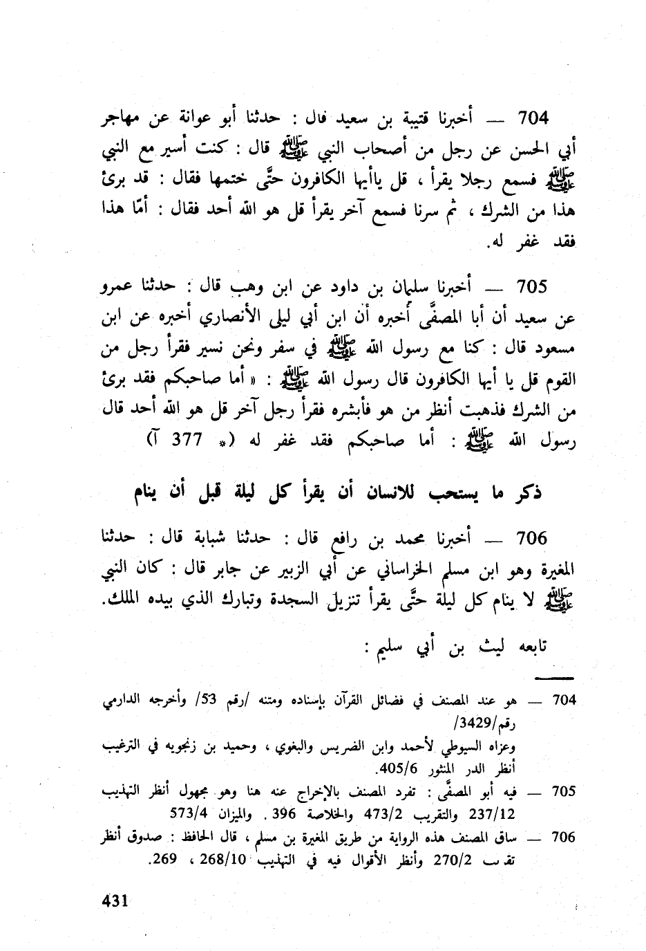 705 - أخبرنَا سلمَان بن دَاوُد عَن ابْن وهب قَالَ حَدثنَا عَمْرو عَن سعيد أَن أَبَا الْمُصَفّى أخبرهُ أَن ابْن أبي ليلى الْأنْصَارِيّ أخبرهُ عَن ابْن مَسْعُود قَالَ كُنَّا مَعَ رَسُول الله صلى الله عَلَيْهِ وَسلم فِي سفر وَنحن نسير فَقَرَأَ رجل من الْقَوْم {قل يَا أَيهَا الْكَافِرُونَ} قَالَ رَسُول الله صلى الله عَلَيْهِ وَسلم