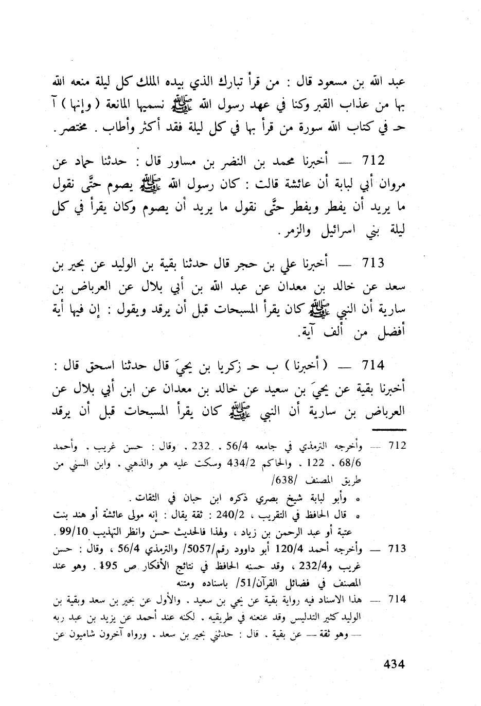 714 - (أخبرنَا) ب ح زَكَرِيَّا بن يحيى قَالَ حَدثنَا اسحق قَالَ أخبرنَا بَقِيَّة عَن يحيى بن سعيد عَن خَالِد بن معدان عَن ابْن أبي بِلَال عَن الْعِرْبَاض بن سَارِيَة أَن النَّبِي صلى الله عَلَيْهِ وَسلم كَانَ يقْرَأ المسبحات قبل أَن يرقد وَقَالَ
