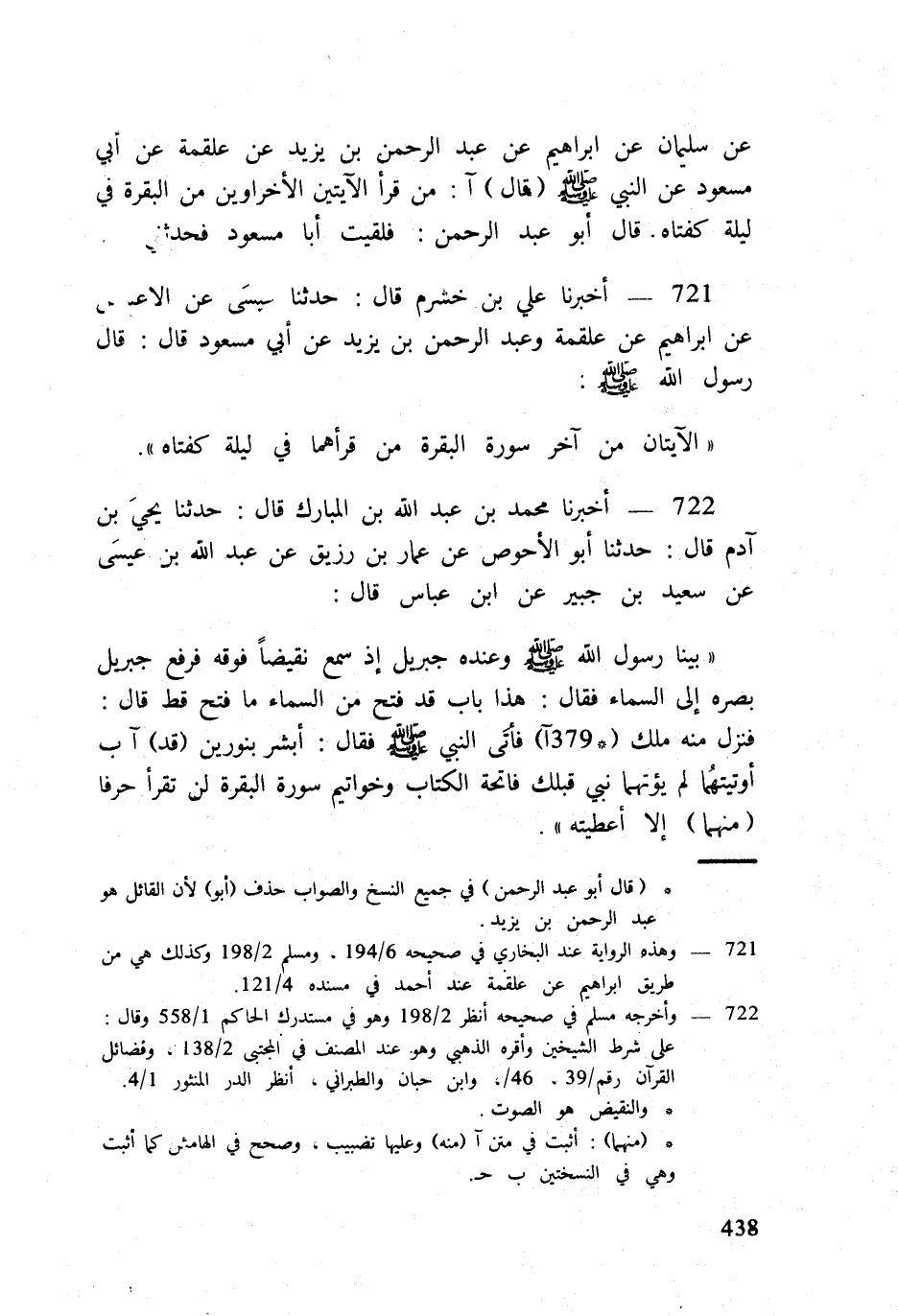 بَينا رَسُول الله صلى الله عَلَيْهِ وَسلم وَعِنْده جِبْرِيل إِذْ سمع نقيضاً فَوْقه فَرفع جِبْرِيل بَصَره إِلَى السَّمَاء فَقَالَ هَذَا بَاب قد فتح من السَّمَاء مَا فتح قطّ قَالَ فَنزل مِنْهُ ملك (379 آ) فأَتى النَّبِي صلى الله عَلَيْهِ وَسلم فَقَالَ أبشر بنورين (قد) آب أوتيتَهما لم يؤتهما نَبِي قبلك فَاتِحَة الْكتاب وخواتيم سُورَة الْبَقَرَة لن تقْرَأ حرفا (مِنْهُمَا) إِلَّا أَعْطيته
