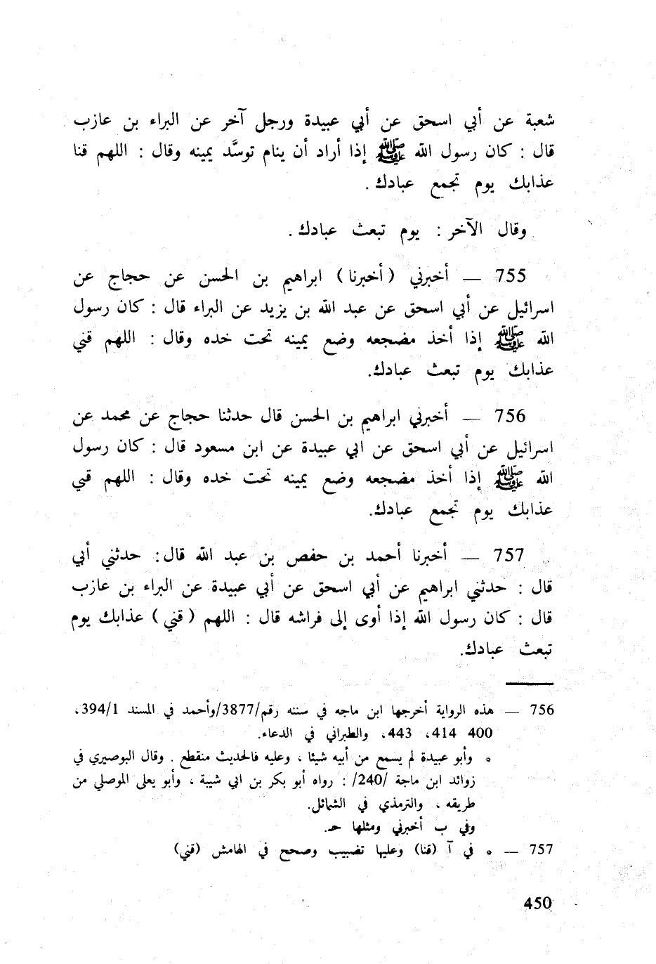 757 - أخبرنَا أَحْمد بن حَفْص بن عبد الله قَالَ حَدثنِي أبي قَالَ حَدثنِي إِبْرَاهِيم عَن أبي اسحق عَن أبي عُبَيْدَة عَن الْبَراء بن عَازِب قَالَ كَانَ رَسُول الله إِذا أَوَى إِلَى فرَاشه قَالَ