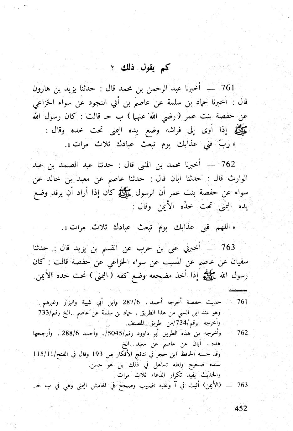 761 - أخبرنَا عبد الرَّحْمَن بن مُحَمَّد قَالَ حَدثنَا يزِيد بن هَارُون قَالَ أخبرنَا حَمَّاد بن سَلمَة عَن عَاصِم بن أبي النجُود عَن سَوَاء الْخُزَاعِيّ عَن حَفْصَة بنت عمر (رَضِي الله عَنْهُمَا) ب ج قَالَت كَانَ رَسُول الله صلى الله عَلَيْهِ وَسلم إِذا أَوَى إِلَى فرَاشه وضع يَده الْيُمْنَى تَحت خَدّه وَقَالَ