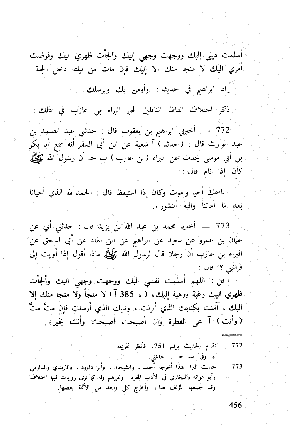 772 - أَخْبرنِي إِبْرَاهِيم بن يَعْقُوب قَالَ حَدثنِي عبد الصَّمد بن عبد الْوَارِث قَالَ (حَدثنَا) آشعبة عَن ابْن أبي السّفر أَنه سمع أَبَا بكر بن أبي مُوسَى يحدث عَن الْبَراء (بن عَازِب) ب ح أَن رَسُول الله صلى الله عَلَيْهِ وَسلم كَانَ إِذا نَام قَالَ
