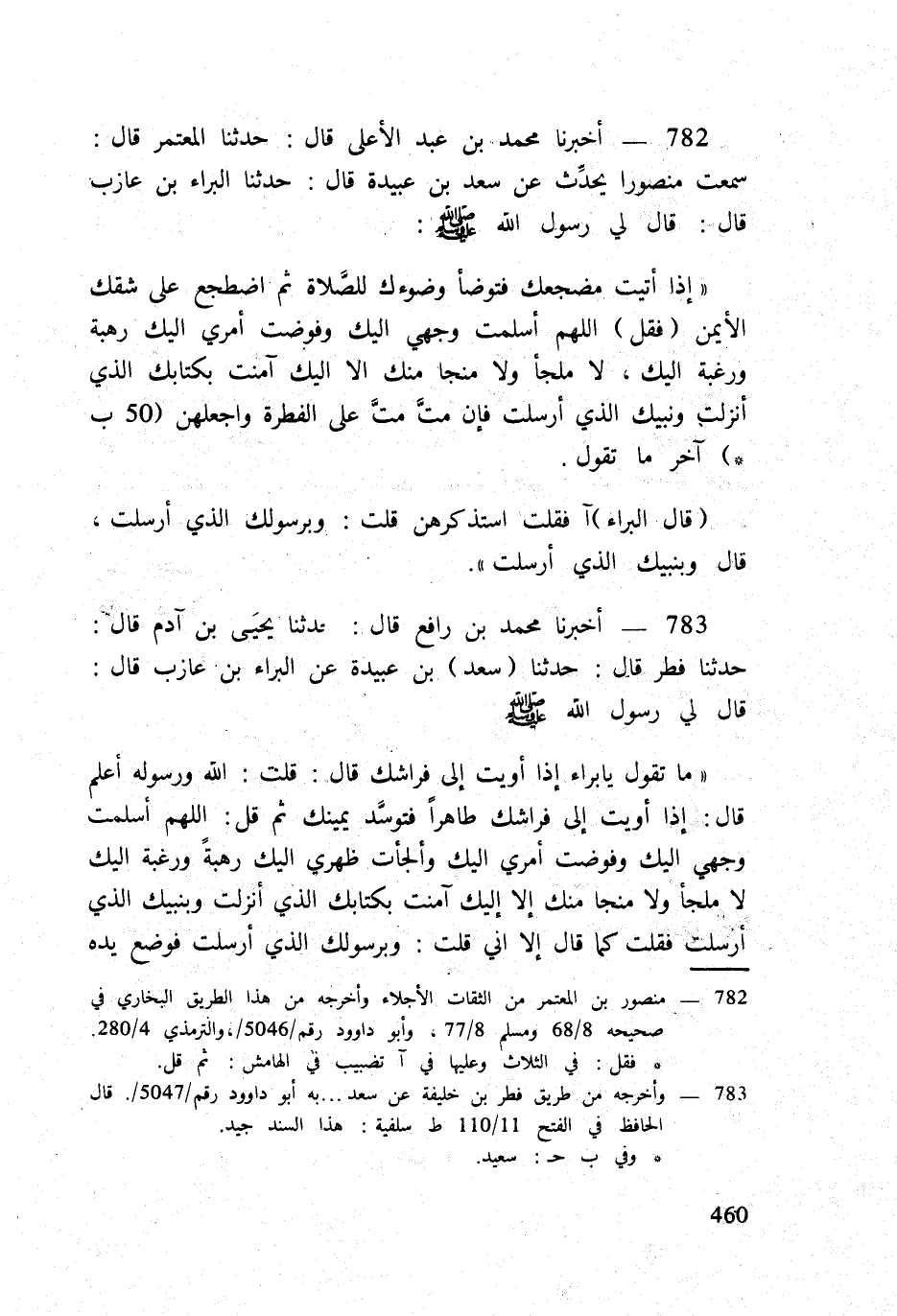 إِذا أتيت مضجعك فَتَوَضَّأ وضوءك للصَّلاة ثمَّ اضْطجع على شقك الْأَيْمن (فَقل) اللَّهُمَّ أسلمت وَجْهي إِلَيْك وفوضت أَمْرِي إِلَيْك رهبةً ورغبةً إِلَيْك لَا ملْجأ وَلَا منجا مِنْك إِلَّا إِلَيْك آمَنت بكتابك الَّذِي أنزلت وَنَبِيك الَّذِي أرْسلت فإِن مت مت على الْفطْرَة واجعلهن (50 ب) آخر مَا تَقول
