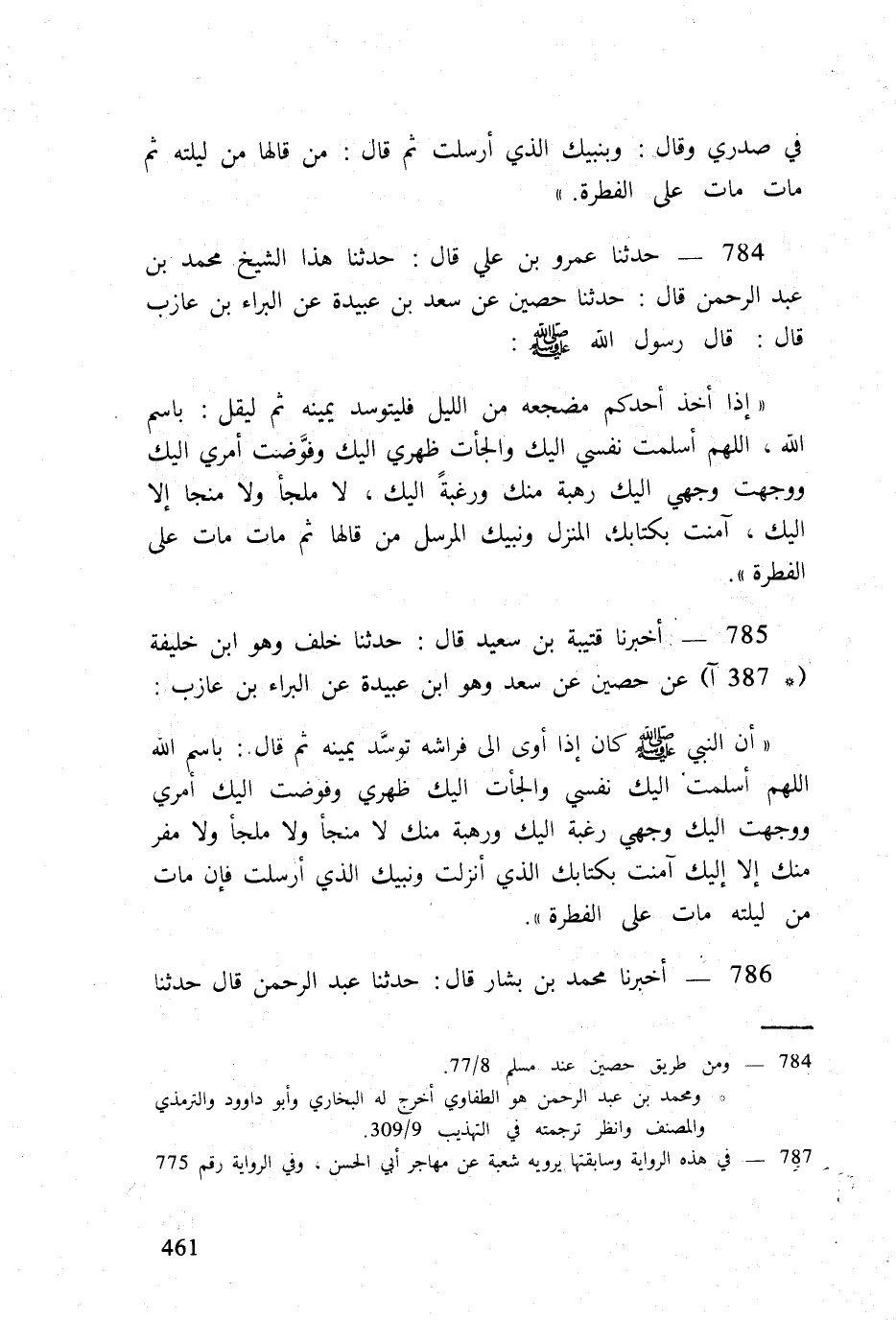 785 - أخبرنَا قُتَيْبَة بن سعيد قَالَ حَدثنَا خلف وَهُوَ ابْن خَليفَة (387 آ) عَن حُصَيْن عَن سعد وَهُوَ ابْن عُبَيْدَة عَن الْبَراء بن عَازِب