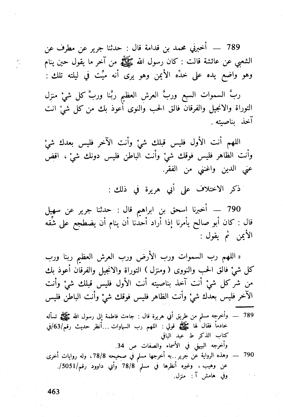 اللَّهُمَّ رب السَّمَوَات وَرب الأَرْض وربَّ الْعَرْش الْعَظِيم ربَّنا وربَّ كل شَيْء فالق الْحبّ والنوى (ومنزل) التَّوْرَاة وَالْإِنْجِيل وَالْفرْقَان أعوذ بك من شَرّ كل شَيْء أَنْت آخذ بناصيته أَنْت الأول فَلَيْسَ قبلك شَيْء وَأَنت الآخر فَلَيْسَ بعْدك شَيْء وَأَنت الظَّاهِر فَلَيْسَ فَوْقك شَيْء وَأَنت الْبَاطِن فَلَيْسَ