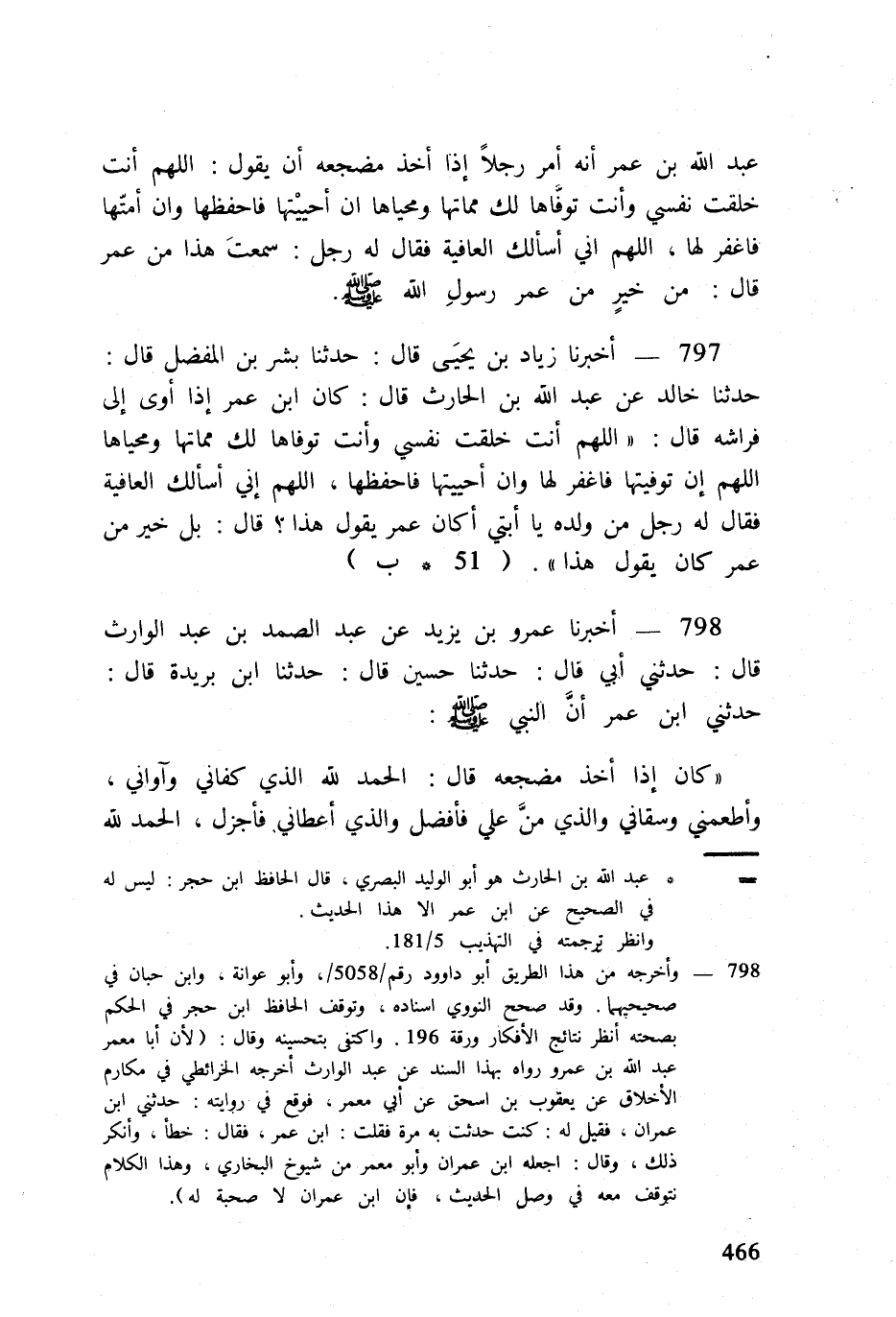 797 - أخبرنَا زِيَاد بن يحيى قَالَ حَدثنَا بشر بن الْمفضل قَالَ حَدثنَا خَالِد عَن عبد الله بن الْحَارِث قَالَ كَانَ ابْن عمر إِذا أَوَى إِلَى فرَاشه قَالَ اللَّهُمَّ أَنْت خلقت نَفسِي وَأَنت توفاها لَك مماتها ومحياها اللَّهُمَّ إِن توفيتها فَاغْفِر لَهَا وَإِن أحييتها فاحفظها اللَّهُمَّ إِنِّي أَسأَلك الْعَافِيَة فَقَالَ لَهُ رجل من وَلَده يَا أبتي أَكَانَ عمر يَقُول هَذَا قَالَ بل خير من عمر كَانَ يَقُول هَذَا (51 ب)