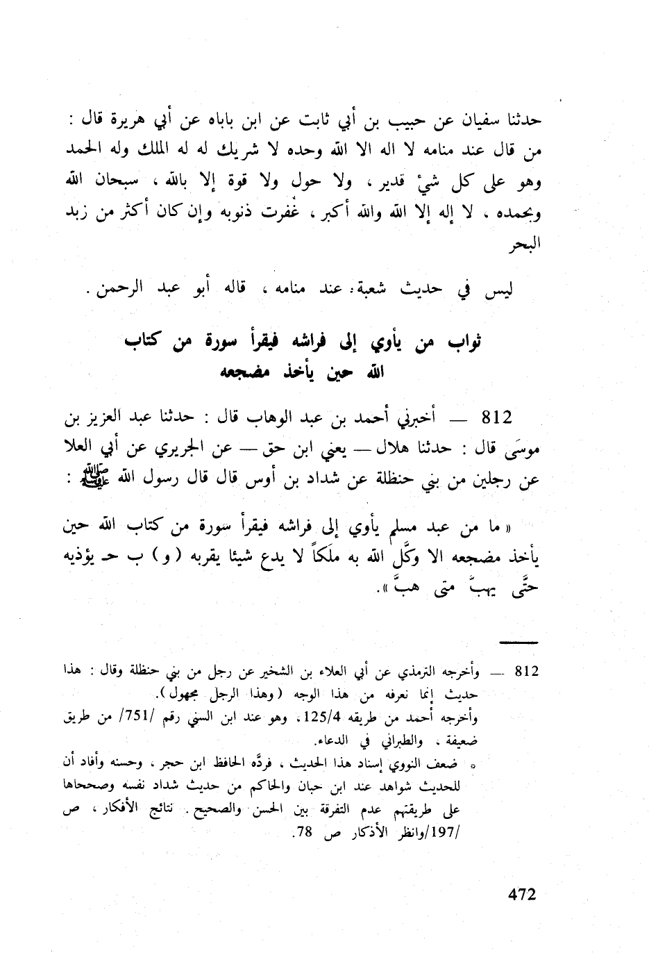 مَا من عبد مُسلم يأوي إِلَى فرَاشه فَيقْرَأ سُورَة من كتاب الله حِين يَأْخُذ مضجعه إِلَّا وكَّل الله بِهِ ملكا لَا يدع شَيْئا يقربهُ (و) ب ح يُؤْذِيه حتَّى يهبَّ مَتى هبَّ
