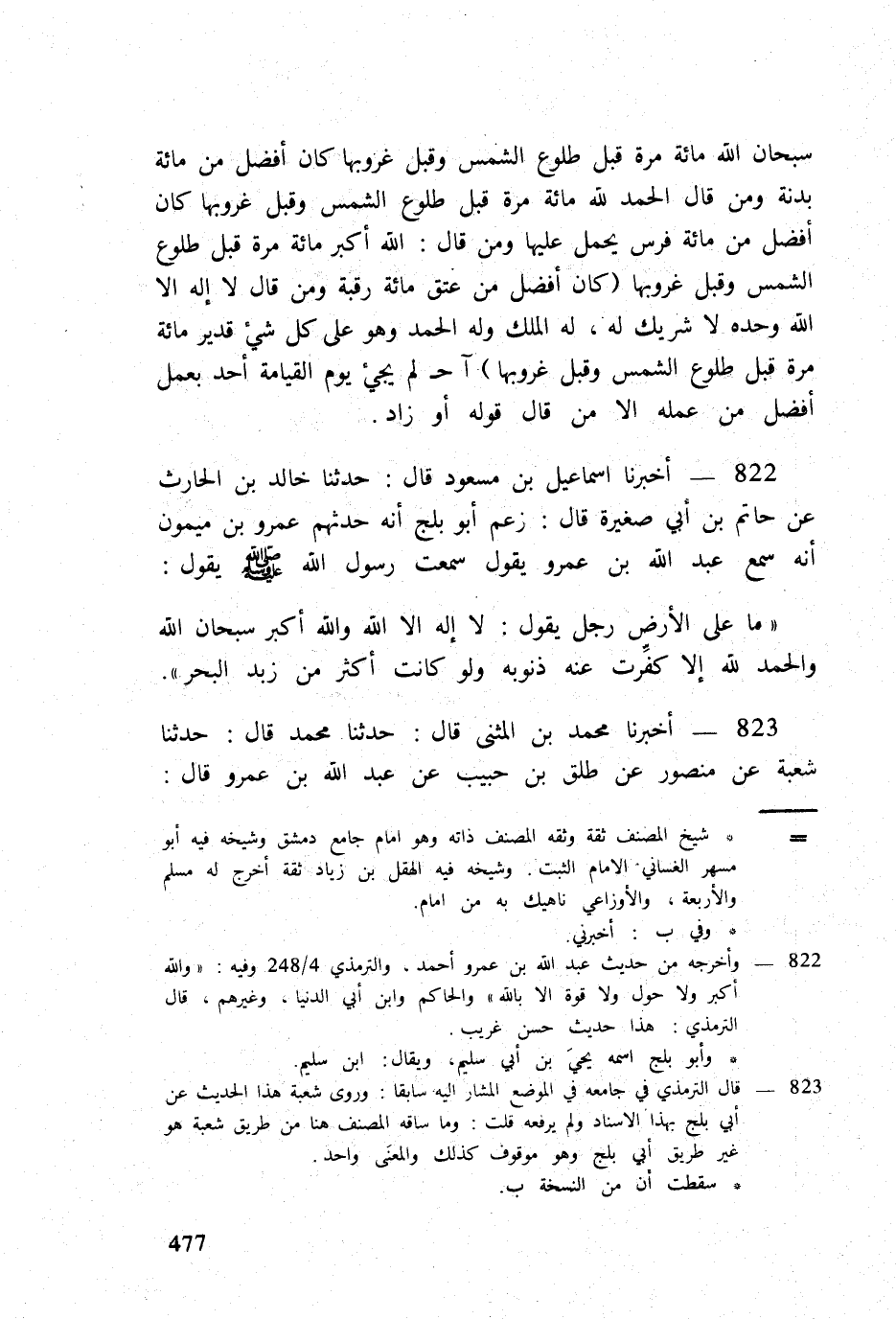 823 - أخبرنَا مُحَمَّد بن الْمثنى قَالَ حَدثنَا مُحَمَّد قَالَ حَدثنَا شُعْبَة عَن مَنْصُور عَن طلق بن حبيب عَن عبد الله بن عَمْرو قَالَ لِأَن أَقُول سُبْحَانَ الله وَلَا إِلَه إِلَّا الله وَالله أكبر وَللَّه الْحَمد أحب إِلَى من (أَن) أحمل على عدتهَا من الْجِيَاد فِي سَبِيل الله بأرسانها