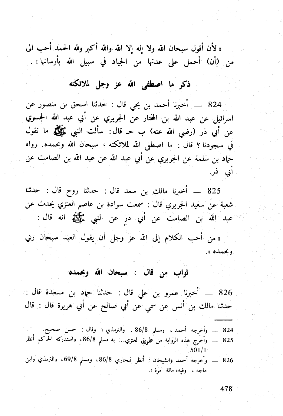 824 - أخبرنَا أَحْمد بن يحيى قَالَ حَدثنَا اسحق بن مَنْصُور عَن اسرائيل عَن عبد الله بن الْمُخْتَار عَن الْجريرِي عَن ابي عبد الله الجسري عَن ابي ذَر (رَضِي الله عَنهُ) ب ح قَالَ سَأَلت النَّبِي صلى الله عَلَيْهِ وَسلم مَا نقُول فِي سجودنا قَالَ مَا اصْطفى الله لملائكته سُبْحَانَ الله وَبِحَمْدِهِ رَوَاهُ حَمَّاد بن سَلمَة عَن الْجريرِي عَن ابي عبد الله عَن عبد الله بن الصَّامِت عَن ابي ذَر