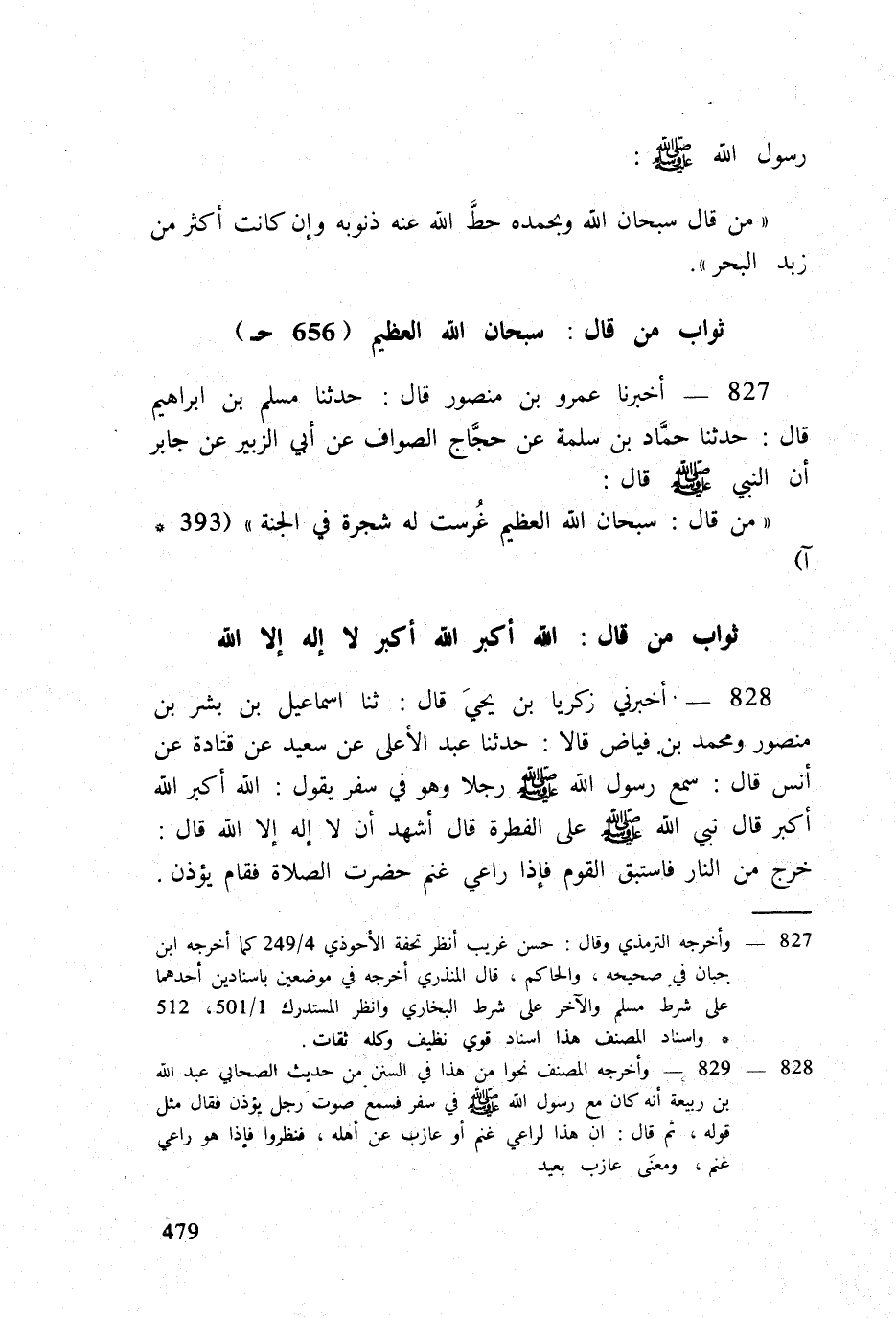 828 - أَخْبرنِي زَكَرِيَّا بن يحيى قَالَ ثَنَا إِسْمَاعِيل بن بشر بن مَنْصُور وَمُحَمّد بن فياض قَالَا حَدثنَا عبد الْأَعْلَى عَن سعيد عَن قَتَادَة عَن أنس قَالَ سمع رَسُول الله صلى الله عَلَيْهِ وَسلم رجلا وَهُوَ فِي سفر يَقُول الله أكبر الله أكبر قَالَ نَبِي الله صلى الله عَلَيْهِ وَسلم على الْفطْرَة قَالَ أشهد أَن لَا إِلَه إِلَّا الله قَالَ خرج من النَّار فَاسْتَبق الْقَوْم فإِذا راعي غنم حضرت الصَّلَاة فَقَامَ يُؤذن