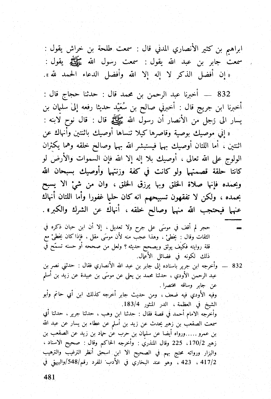 832 - أخبرنَا عبد الرَّحْمَن بن مُحَمَّد قَالَ حَدثنَا حجاج قَالَ أخبرنَا بن جريج قَالَ أَخْبرنِي صَالح بن سعيد حَدِيثا رَفعه الى سُلَيْمَان بن يسَار الى رجل من الْأَنْصَار أَن رَسُول الله صلى الله عَلَيْهِ وَسلم قَالَ قَالَ نوح لِابْنِهِ