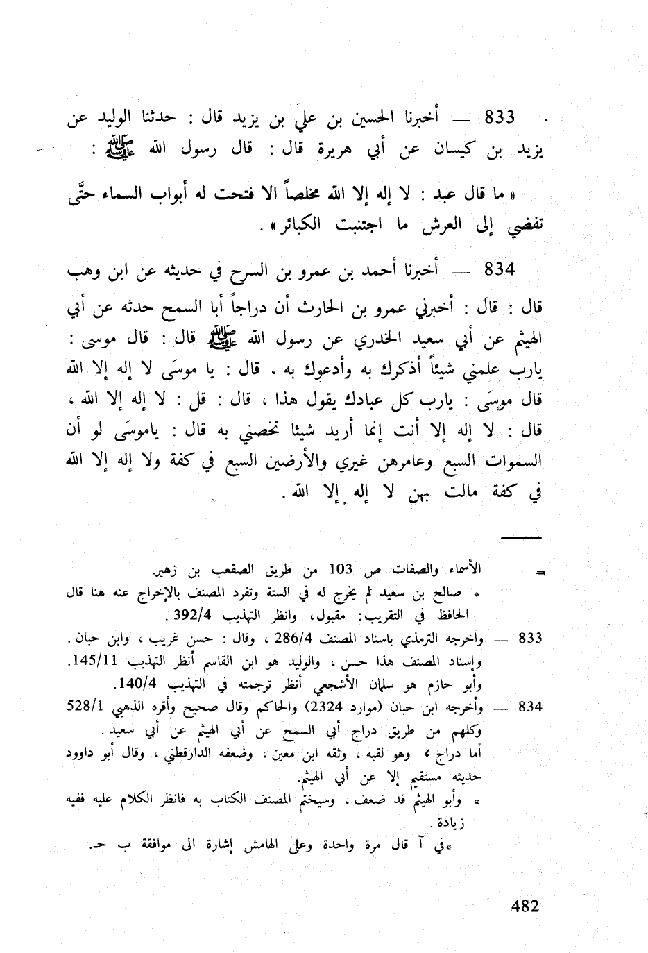 834 - أخبرنَا أَحْمد بن عَمْرو بن السَّرْح فِي حَدِيثه عَن ابْن وهب قَالَ قَالَ أَخْبرنِي عَمْرو بن الْحَارِث ان دَرَّاجًا أَبَا السَّمْح حَدثهُ عَن أبي الْهَيْثَم عَن أبي سعيد الْخُدْرِيّ عَن رَسُول الله صلى الله عَلَيْهِ وَسلم قَالَ قَالَ مُوسَى يَا رب عَلمنِي شَيْئا اذكرك بِهِ وأدعوك بِهِ قَالَ يَا مُوسَى لَا إِلَه إِلَّا الله قَالَ موسَى يَا رب كل عِبَادك يَقُول هَذَا قَالَ قل لَا إِلَه إِلَّا الله قَالَ لَا إِلَه إِلَّا أَنْت إِنَّمَا أُرِيد شَيْئا تخصني بِهِ قَالَ يَا مُوسَى لَو أَن السَّمَوَات السَّبع وعامرهن غَيْرِي وَالْأَرضين السَّبع فِي كفة وَلَا إِلَه إِلَّا الله فِي كفة مَالَتْ بِهن لَا إِلَه إِلَّا الله