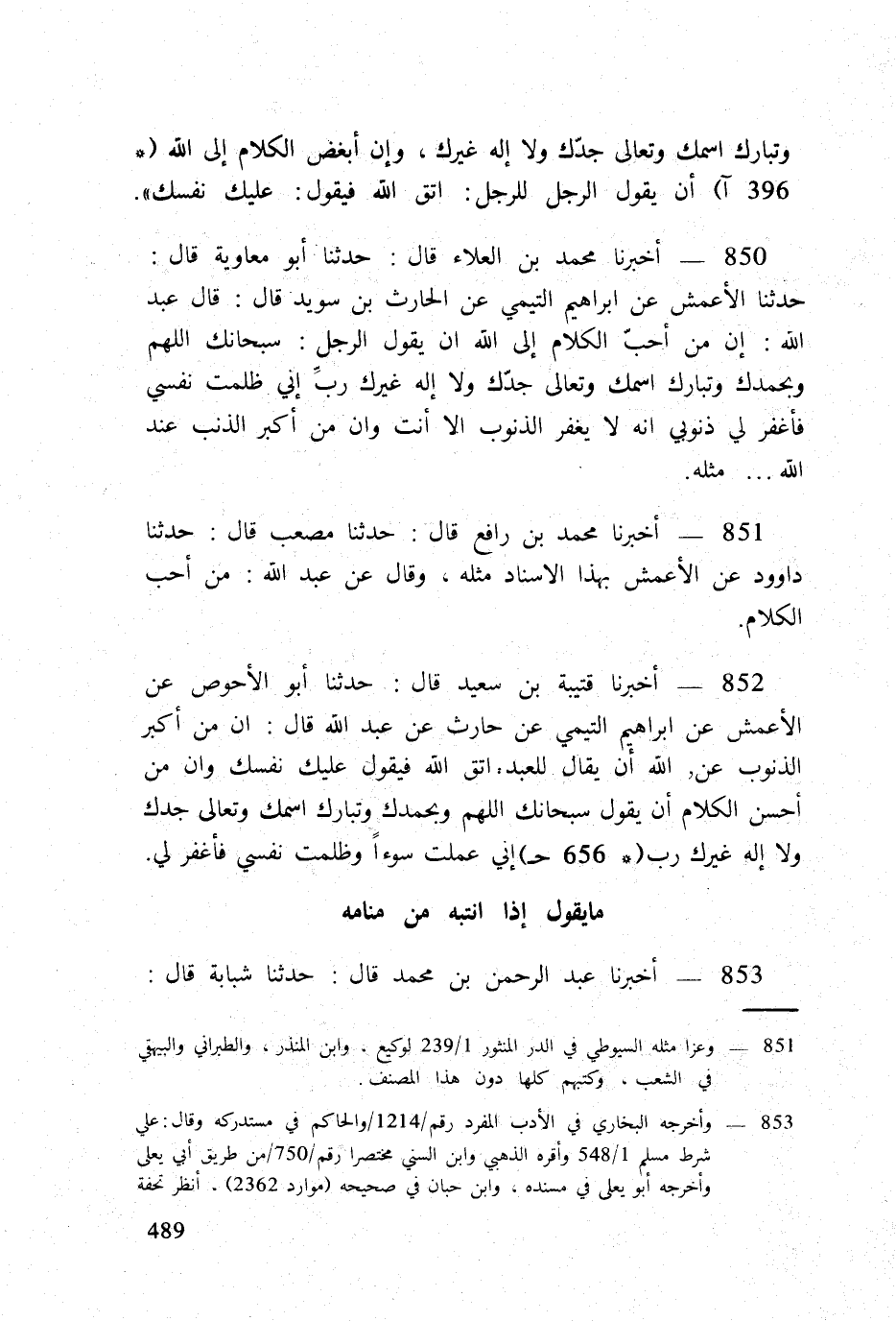 850 - أخبرنَا مُحَمَّد بن الْعَلَاء قَالَ حَدثنَا أَبُو مُعَاوِيَة قَالَ حَدثنَا الْأَعْمَش عَن ابراهيم التَّيْمِيّ عَن الْحَارِث بن سُوَيْد قَالَ قَالَ عبد الله إِن من أحب الْكَلَام إِلَى الله ان يَقُول الرجل سُبْحَانَكَ اللَّهُمَّ وَبِحَمْدِك وتبارك إسمك وَتَعَالَى جدك وَلَا إِلَه غَيْرك رب إِنِّي ظلمت نَفسِي فَاغْفِر لي ذُنُوبِي إِنَّه لَا يغْفر الذُّنُوب إِلَّا انت وان من اكبر الذَّنب عِنْد الله مثله