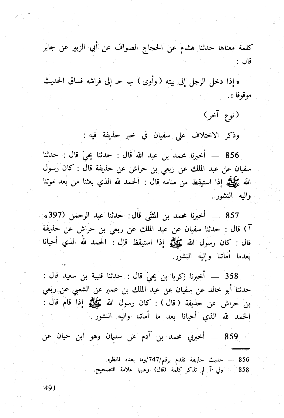 858 - أخبرنَا زَكَرِيَّا بن يحيى قَالَ حَدثنَا قُتَيْبَة بن سعيد قَالَ حَدثنَا أَبُو خَالِد عَن سُفْيَان عَن عبد الْملك بن عُمَيْر عَن الشّعبِيّ عَن ربعي بن حِرَاش عَن حُذَيْفَة (قَالَ) كَانَ رَسُول الله صلى الله عَلَيْهِ وَسلم إِذا قَامَ قَالَ الْحَمد لله الَّذِي أَحْيَانًا بعد مَا أماتنا وَإِلَيْهِ النشور