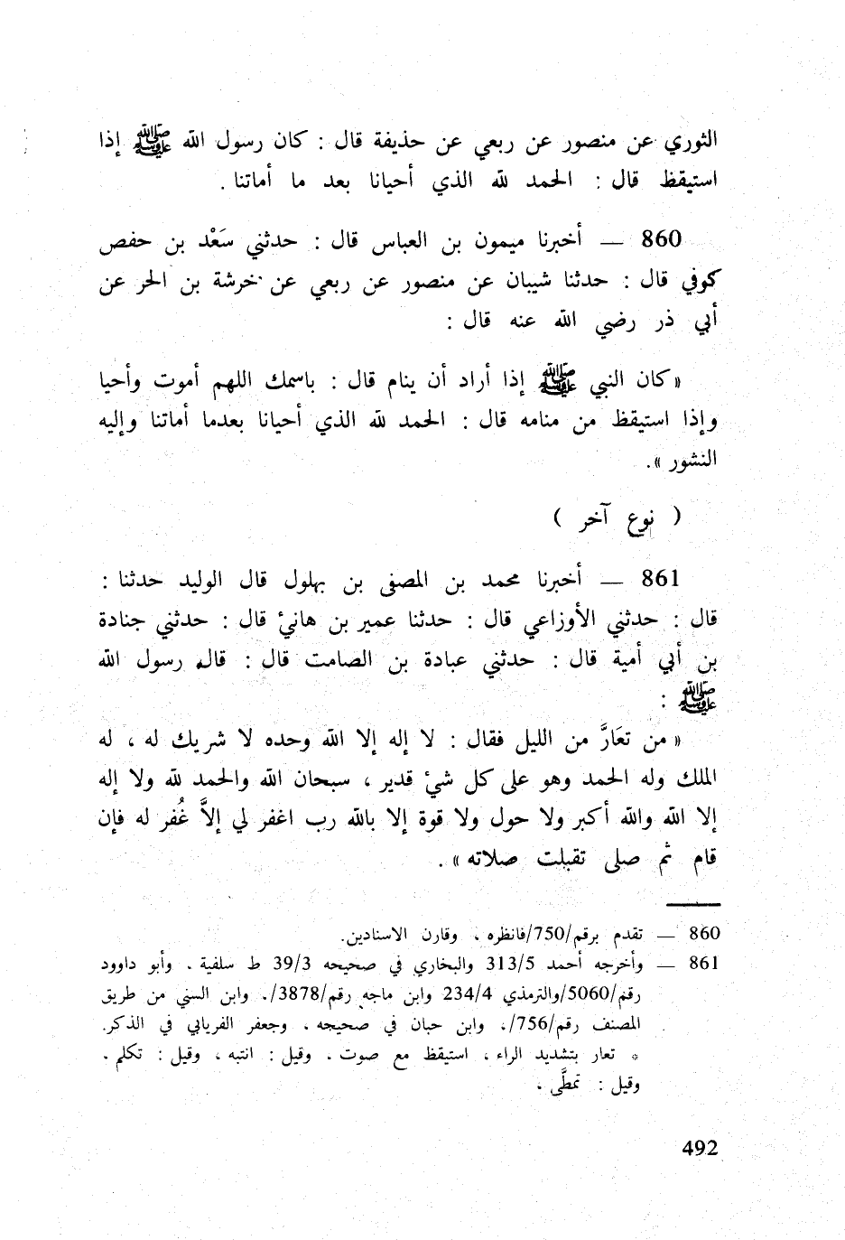 861 - أخبرنَا مُحَمَّد بن الْمُصَفّى بن بهْلُول قَالَ الْوَلِيد حَدثنَا قَالَ حَدثنِي الْأَوْزَاعِيّ قَالَ حَدثنَا عُمَيْر بن هَانِئ قَالَ حَدثنِي جُنَادَة بن أبي أُميَّة قَالَ حَدثنِي عبَادَة بن الصَّامِت قَالَ قَالَ رَسُول الله صلى الله عَلَيْهِ وَسلم