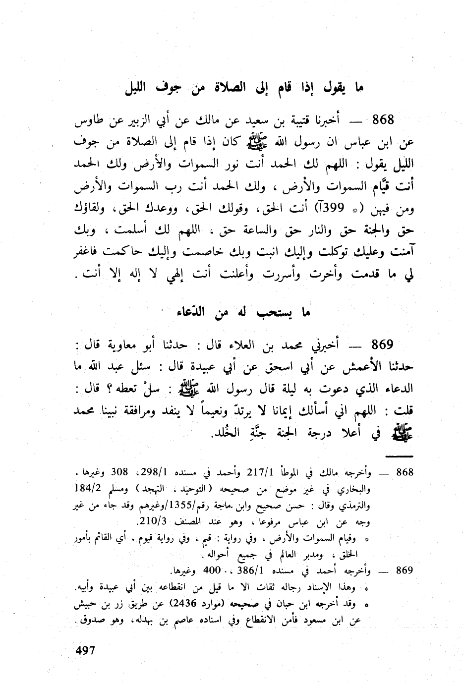 اللَّهُمَّ لَك الْحَمد أَنْت نور السَّمَوَات وَالْأَرْض وَلَك الْحَمد أَنْت قيَّام السَّمَوَات وَالْأَرْض وَلَك الْحَمد أَنْت رب السَّمَوَات وَالْأَرْض وَمن فِيهِنَّ (399 آ) أَنْت الْحق وقولك الْحق وَوَعدك الْحق ولقاؤك حق وَالْجنَّة حق وَالنَّار حق والساعة حق اللَّهُمَّ لَك أسلمت وَبِك آمَنت وَعَلَيْك توكلت وَإِلَيْك أنبت وَبِك خَاصَمت وَإِلَيْك حاكمت فَاغْفِر لي مَا قدمت وأخرت وأسررت وأعلنت أَنْت إلهي لَا إِلَه إِلَّا أَنْت