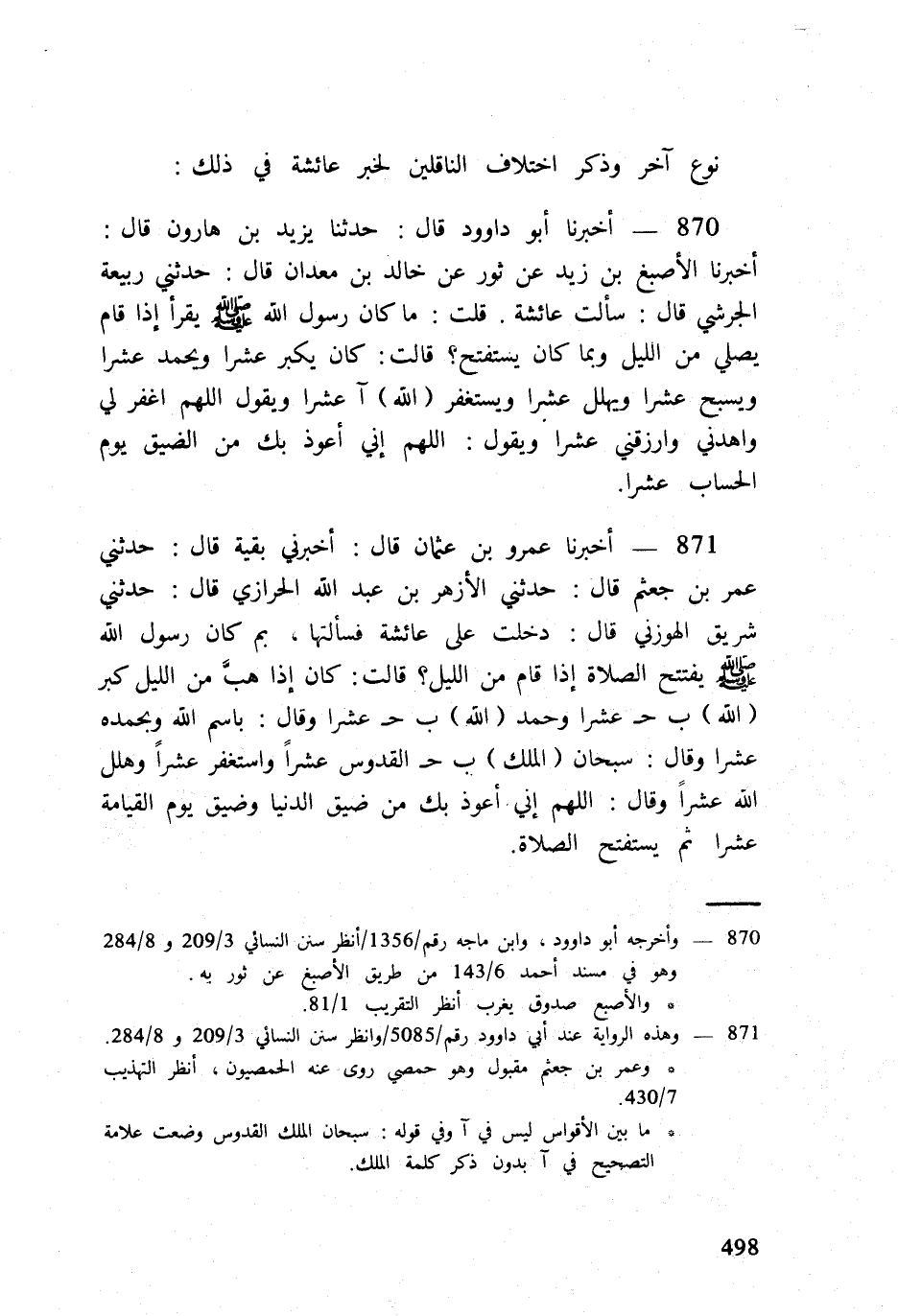 871 - أخبرنَا عَمْرو بن عُثْمَان قَالَ أَخْبرنِي بَقِيَّة قَالَ حَدثنِي عمر بن جعثم قَالَ حَدثنِي الْأَزْهَر بن عبد الله الْحرَازِي قَالَ حَدثنِي شريق الْهَوْزَنِي قَالَ دخلت على عَائِشَة فسألتها بِمَ كَانَ رَسُول الله صلى الله عَلَيْهِ وَسلم يفْتَتح الصَّلَاة إِذا قَامَ من اللَّيْل قَالَت كَانَ إِذا هبَّ من اللَّيْل كبر (الله) ب ح عشرا وَحمد (الله) ب ح عشرا وَقَالَ باسم الله وَبِحَمْدِهِ عشرا وَقَالَ سُبْحَانَ (الْملك) ب ح القدوس عشرا واستغفر عشرا وَهَلل الله عشرا وَقَالَ اللَّهُمَّ إِنِّي أعوذ بك من ضيق الدُّنْيَا وضيق يَوْم الْقِيَامَة عشرا ثمَّ يستفتح الصَّلَاة
