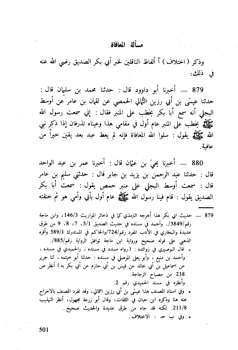 880 - أخبرنَا يحيى بن عُثْمَان قَالَ أخبرنَا عمر بن عبد الْوَاحِد قَالَ حَدثنَا عبد الرَّحْمَن بن يزِيد بن جَابر قَالَ حَدثنِي سليم بن عَامر قَالَ سَمِعت أَوسط البَجلِيّ على مِنْبَر حمص يَقُول سَمِعت أَبَا بكر الصّديق يَقُول قَامَ فِينَا رَسُول الله صلى الله عَلَيْهِ وَسلم عَام أول بِأبي وَأمي هُوَ ثمَّ خنقته الْعبْرَة ثمَّ قَالَ قَامَ فِينَا رَسُول الله صلى الله عَلَيْهِ وَسلم عَام أول بِأبي وَأمي هُوَ فَقَالَ سلوا الله المعافاة فَإِنَّهُ لم يُؤْت عبد بعد يَقِين خيرا من معافاة