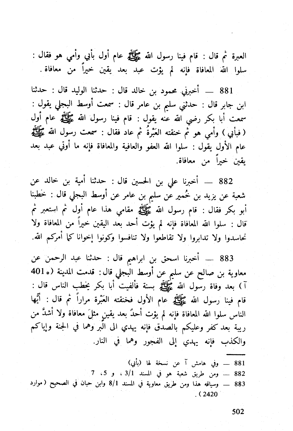 881 - أَخْبرنِي مَحْمُود بن خَالِد قَالَ حَدثنَا الْوَلِيد قَالَ حَدثنَا ابْن جَابر قَالَ حَدثنِي سليم بن عَامر قَالَ سَمِعت أَوسط البَجلِيّ يَقُول سَمِعت أَبَا بكر رَضِي الله عَنهُ يَقُول قَامَ فِينَا رَسُول الله صلى الله عَلَيْهِ وَسلم عَام أول (فبأبي) وَأمي هُوَ ثمَّ خنقته الْعبْرَة ثمَّ عَاد فَقَالَ سَمِعت رَسُول الله صلى الله عَلَيْهِ وَسلم عَام الأول يَقُول سلوا الله الْعَفو والعافية والمعافاة فَإِنَّهُ مَا أُوتِيَ عبد بعد يَقِين خيرا من معافاة