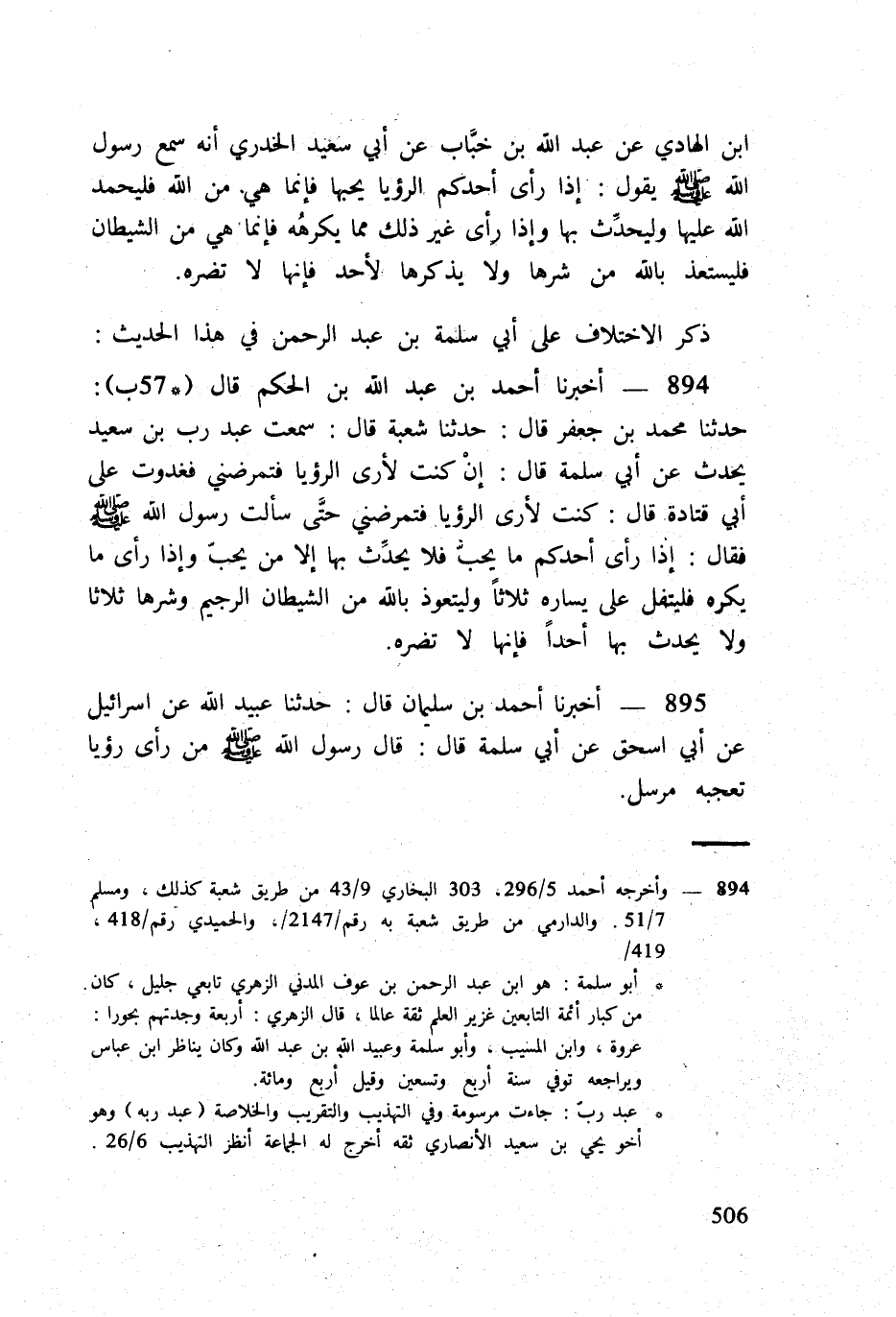 894 - أخبرنَا أَحْمد بن عبد الله بن الحكم قَالَ (57 ب) حَدثنَا مُحَمَّد بن جَعْفَر قَالَ حَدثنَا شُعْبَة قَالَ سَمِعت عبد رب بن سعيد يحدث عَن أبي سَلمَة قَالَ إِن كنت لأرى الرُّؤْيَا فتمرضني فَغَدَوْت على أبي قَتَادَة قَالَ كنت لأرى الرُّؤْيَا فتمرضني حتَّى سَأَلت رَسُول الله صلى الله عَلَيْهِ وَسلم فَقَالَ