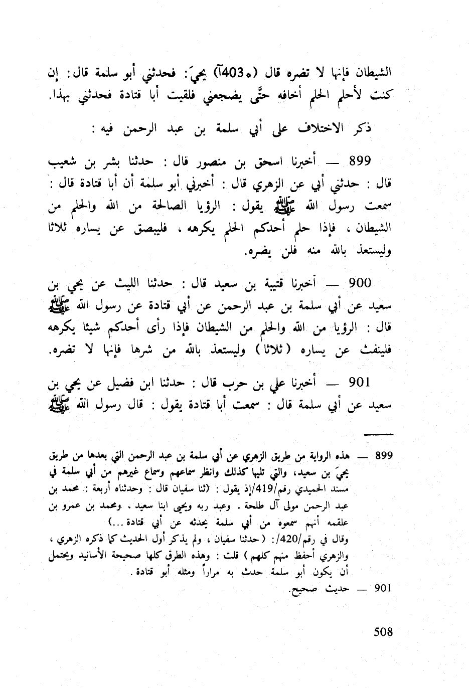 900 - أخبرنَا قُتَيْبَة بن سعيد قَالَ حَدثنَا اللَّيْث عَن يحي بن سعيد عَن أبي سَلمَة بن عبد الرَّحْمَن عَن أبي قَتَادَة عَن رَسُول الله صلى الله عَلَيْهِ وَسلم قَالَ