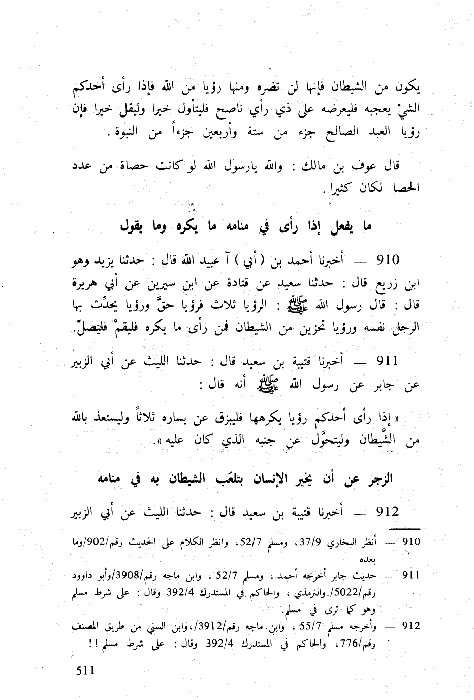 912 - أخبرنَا قُتَيْبَة بن سعيد قَالَ حَدثنَا اللَّيْث عَن أبي الزبير عَن جَابر عَن رَسُول الله صلى الله عَلَيْهِ وَسلم أَنه قَالَ لأعرابي جَاءَهُ قَالَ إِنِّي حلمت أَن رَأْسِي قُطع فَأَنا أتبعه فزجره النَّبِي صلى الله عَلَيْهِ وَسلم فَقَالَ