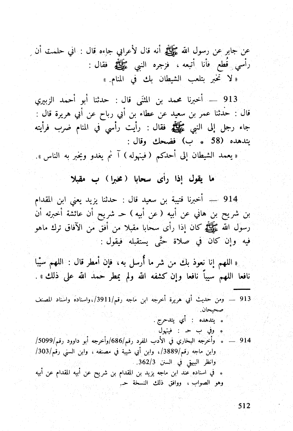 913 - أخبرنَا مُحَمَّد بن الْمثنى قَالَ حَدثنَا أَبُو أَحْمد الزبيرِي قَالَ حَدثنَا عمر بن سعيد عَن عَطاء بن أبي رَبَاح عَن أبي هُرَيْرَة قَالَ جَاءَ رجل إِلَى النَّبِي صلى الله عَلَيْهِ وَسلم فَقَالَ رَأَيْت رَأْسِي فِي الْمَنَام ضرب فرأيته يتدهده (58 ب) فَضَحِك وَقَالَ