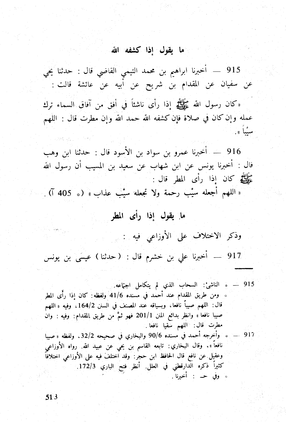 917 - أخبرنَا عَليّ بن خشرم قَالَ (حَدثنَا) عِيسَى بن يُونُس عَن الْأَوْزَاعِيّ عَن الزُّهْرِيّ عَن الْقَاسِم بن مُحَمَّد عَن عَائِشَة أَن رَسُول الله صلى الله عَلَيْهِ وَسلم كَانَ إِذا رأى الْمَطَر قَالَ
