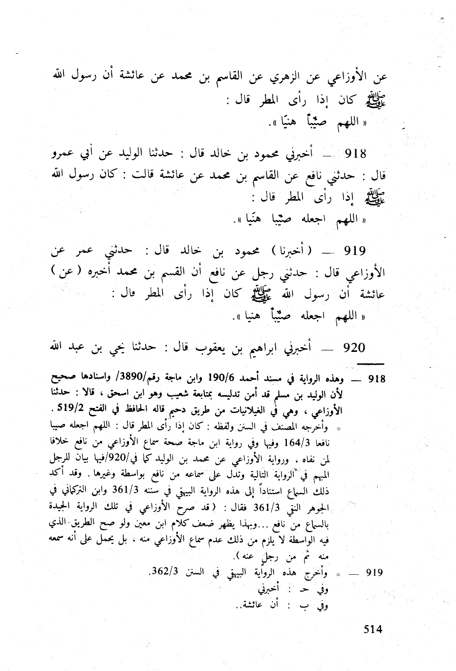 920 - أَخْبرنِي إِبْرَاهِيم بن يَعْقُوب قَالَ حَدثنَا يحي بن عبد الله بن الضَّحَّاك قَالَ حَدثنَا الْأَوْزَاعِيّ قَالَ حَدثنِي مُحَمَّد بن الْوَلِيد عَن نَافِع أَن الْقَاسِم بن مُحَمَّد أخبرهُ عَن عَائِشَة أَن رَسُول الله صلى الله عَلَيْهِ وَسلم كَا إِذا رأى الْمَطَر قَالَ