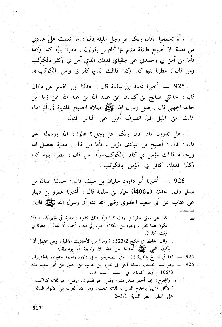 926 - أخبرنَا أَبُو دَاوُد سُلَيْمَان بن سيف قَالَ حَدثنَا عَفَّان بن مُسلم قَالَ حَدثنَا (406 آ) حَمَّاد بن سَلمَة قَالَ أخبرنَا عَمْرو بن دِينَار عَن عتاب عَن أبي سعيد الْخُدْرِيّ رَضِي الله عَنهُ أَن رَسُول الله صلى الله عَلَيْهِ وَسلم قَالَ لَو حبس الله الْقطر عَن أمتِي عشر سِنِين ثمَّ أنزل مَاء لأصبحت طَائِفَة من أمتِي بهَا كَافِرين يَقُولُونَ هُوَ بِنَوْء المجدح قَالَ ابو عبد الرَّحْمَن المجدح الشعري