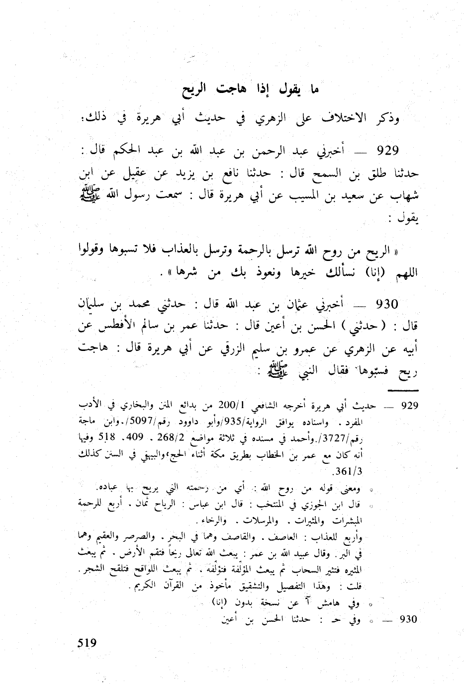 930 - أَخْبرنِي عُثْمَان بن عبد الله قَالَ حَدثنِي مُحَمَّد بن سُلَيْمَان قَالَ (حَدثنِي) الْحسن بن أعين قَالَ حَدثنَا عمر بن سَالم الْأَفْطَس عَن أَبِيه عَن الزُّهْرِيّ عَن عَمْرو بن سليم الزرقي عَن أبي هُرَيْرَة قَالَ هَاجَتْ ريح فسبوها فَقَالَ النَّبِي صلى الله عَلَيْهِ وَسلم