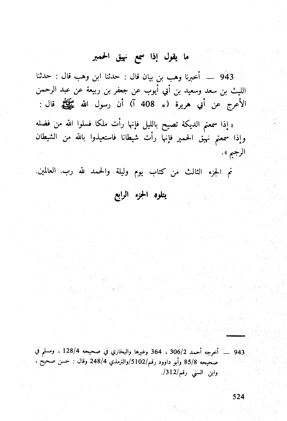 تمّ الْجُزْء الثَّالِث من كتاب يَوْم وَلَيْلَة وَالْحَمْد لله رب الْعَالمين