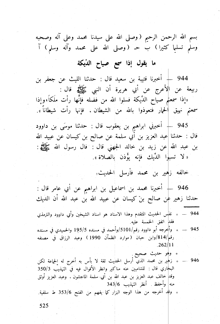 946 - أخبرنَا مُحَمَّد بن اسماعيل بن ابراهيم عَن أبي عَامر قَالَ حَدثنَا زُهَيْر بن صَالح بن كيسَان عَن عبيد الله بن عبد الله أَن الديك صَوت عِنْد رَسُول الله صلى الله عَلَيْهِ وَسلم فَسَبهُ رجل من الْأَنْصَار فَقَالَ