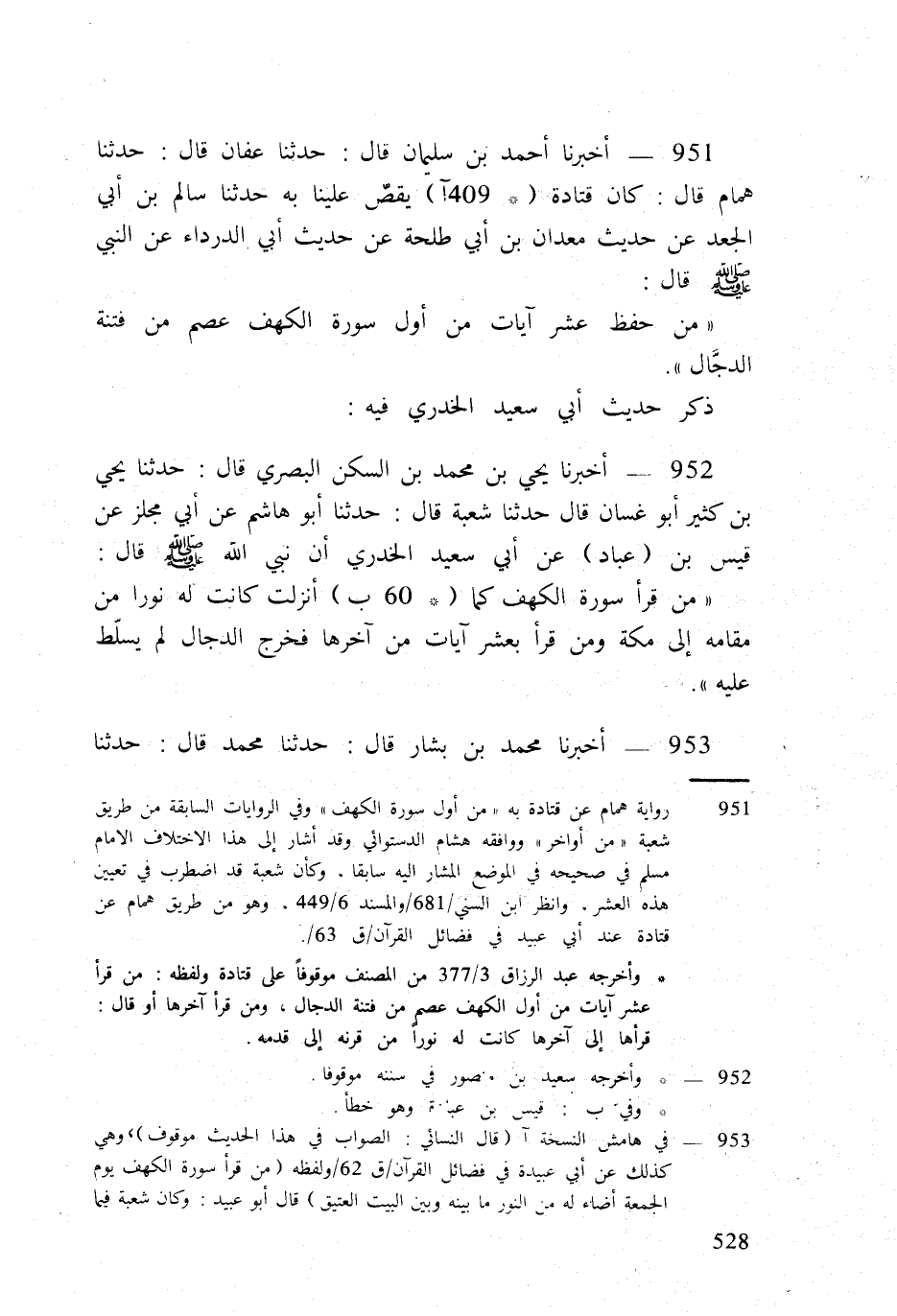 951 - أخبرنَا أَحْمد بن سُلَيْمَان قَالَ حَدثنَا عَفَّان قَالَ حَدثنَا همام قَالَ كَانَ قَتَادَة (409 آ) يقص علينا بِهِ حَدثنَا سَالم بن أبي الْجَعْد عَن حَدِيث معدان بن أبي طَلْحَة عَن حَدِيث أبي الدَّرْدَاء عَن النَّبِي صلى الله عَلَيْهِ وَسلم قَالَ
