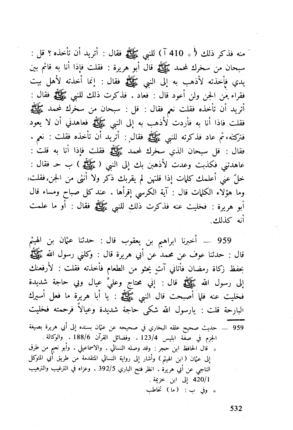مِنْهُ فَذكر ذَلِك (410 آ) للنَّبِي صلى الله عَلَيْهِ وَسلم فَقَالَ أَتُرِيدُ أَن تَأْخُذهُ قل سُبْحَانَ من سخرك لمُحَمد صلى الله عَلَيْهِ وَسلم قَالَ أَبُو هُرَيْرَة فَقلت فَإِذا أَنا بِهِ قَائِم بَين يَدي فَأَخَذته لأذهب بِهِ إِلَى النَّبِي صلى الله عَلَيْهِ وَسلم فَقَالَ إِنَّمَا أَخَذته لأهل بَيت فُقَرَاء من الْجِنّ وَلنْ أَعُود قَالَ فَعَاد فَذكرت ذَلِك للنَّبِي صلى الله عَلَيْهِ وَسلم فَقَالَ أَتُرِيدُ أَن تَأْخُذهُ فَقلت نعم فَقَالَ قل سُبْحَانَ من سخرك لمُحَمد صلى الله عَلَيْهِ وَسلم فَقلت فاذا أَنا بِهِ فَأَرَدْت لأذهب بِهِ إِلَى النَّبِي صلى الله عَلَيْهِ وَسلم فعاهدني أَن لَا يعود فتركته ثمَّ عَاد فَذَكرته للنَّبِي صلى الله عَلَيْهِ وَسلم فَقَالَ أَتُرِيدُ أَن تَأْخُذهُ فَقلت نعم فَقَالَ قل سُبْحَانَ الَّذِي سخرك لمُحَمد صلى الله عَلَيْهِ وَسلم فَقلت فَإِذا أَنا بِهِ قلت عاهدتني فَكَذبت وعدت لأذهبن بك إِلَى النَّبِي صلى الله عَلَيْهِ وَسلم ب ح فَقَالَ خل عني أعلمك كَلِمَات إِذا قلتهن لم يقربك ذكر وَلَا أُنْثَى من الْجِنّ فَقلت وَمَا هَؤُلَاءِ الكمات قَالَ آيَة الْكُرْسِيّ إقرأها عِنْد كل صباح وَمَسَاء قَالَ أَبُو هُرَيْرَة فخليت عَنهُ فَذكرت ذَلِك للنَّبِي صلى الله عَلَيْهِ وَسلم فَقَالَ أَو مَا علمت أَنه كَذَلِك