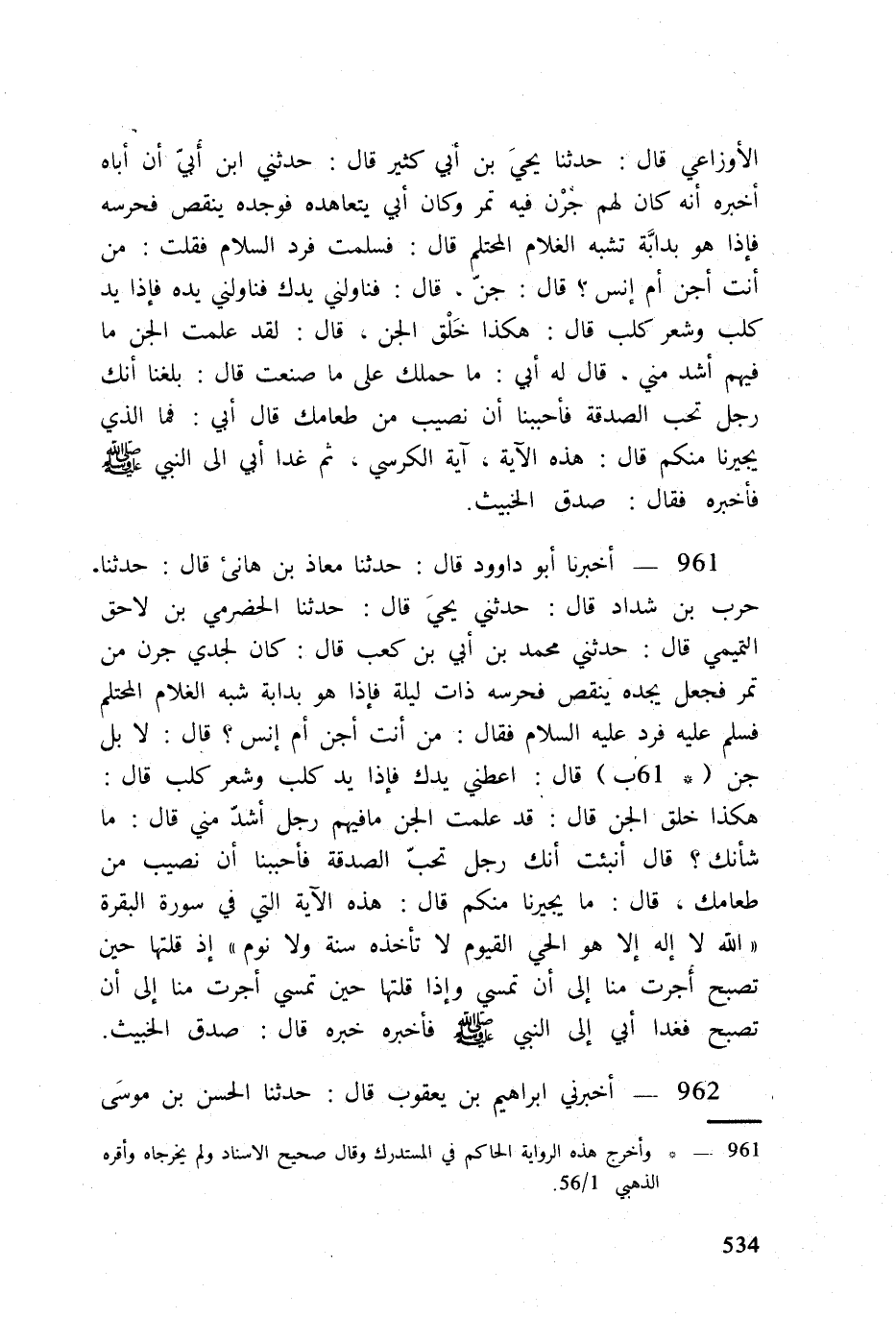 961 - أخبرنَا أَبُو دَاوُود قَالَ حَدثنَا معَاذ بن هَانِئ قَالَ حَدثنَا حَرْب بن شَدَّاد قَالَ حَدثنِي يحي قَالَ حَدثنَا الْحَضْرَمِيّ بن لَاحق التَّمِيمِي قَالَ حَدثنِي مُحَمَّد بن أبي بن كَعْب قَالَ كَانَ لجدي جرن من تمر فَجعل يجده ينقص فحرسه ذَات لَيْلَة فَإِذا هُوَ بِدَابَّة شبه الْغُلَام المحتلم فَسلم عَلَيْهِ فَرد عَلَيْهِ السَّلَام فَقَالَ من أَنْت أجن أم إنس قَالَ لَا بل جن (61 ب) قَالَ اعطني يدك فإِذا يَد كلب وَشعر كلب قَالَ هَكَذَا خلق الْجِنّ قَالَ قد علمت الْجِنّ مَا فيهم رجل أَشد مني قَالَ مَا شَأْنك قَالَ أنبئت أَنَّك رجل تحب الصَّدَقَة فأحببنا أَن نصيب من طَعَامك قَالَ مَا يجيرنا مِنْكُم قَالَ هَذِه الْآيَة الَّتِي فِي سُورَة الْبَقَرَة {الله لَا إِلَه إِلَّا هُوَ الْحَيّ القيوم لَا تَأْخُذهُ سنة وَلَا نوم} إِذْ قلتهَا حِين تصبح أجرت منا إِلَى أَن تمسي وَإِذا قلتهَا حِين تمسي أجرت منا إِلَى أَن تصبح فغدا أبيّ إِلَى النَّبِي صلى الله عَلَيْهِ وَسلم فَأخْبرهُ خَبره قَالَ صدق الْخَبيث