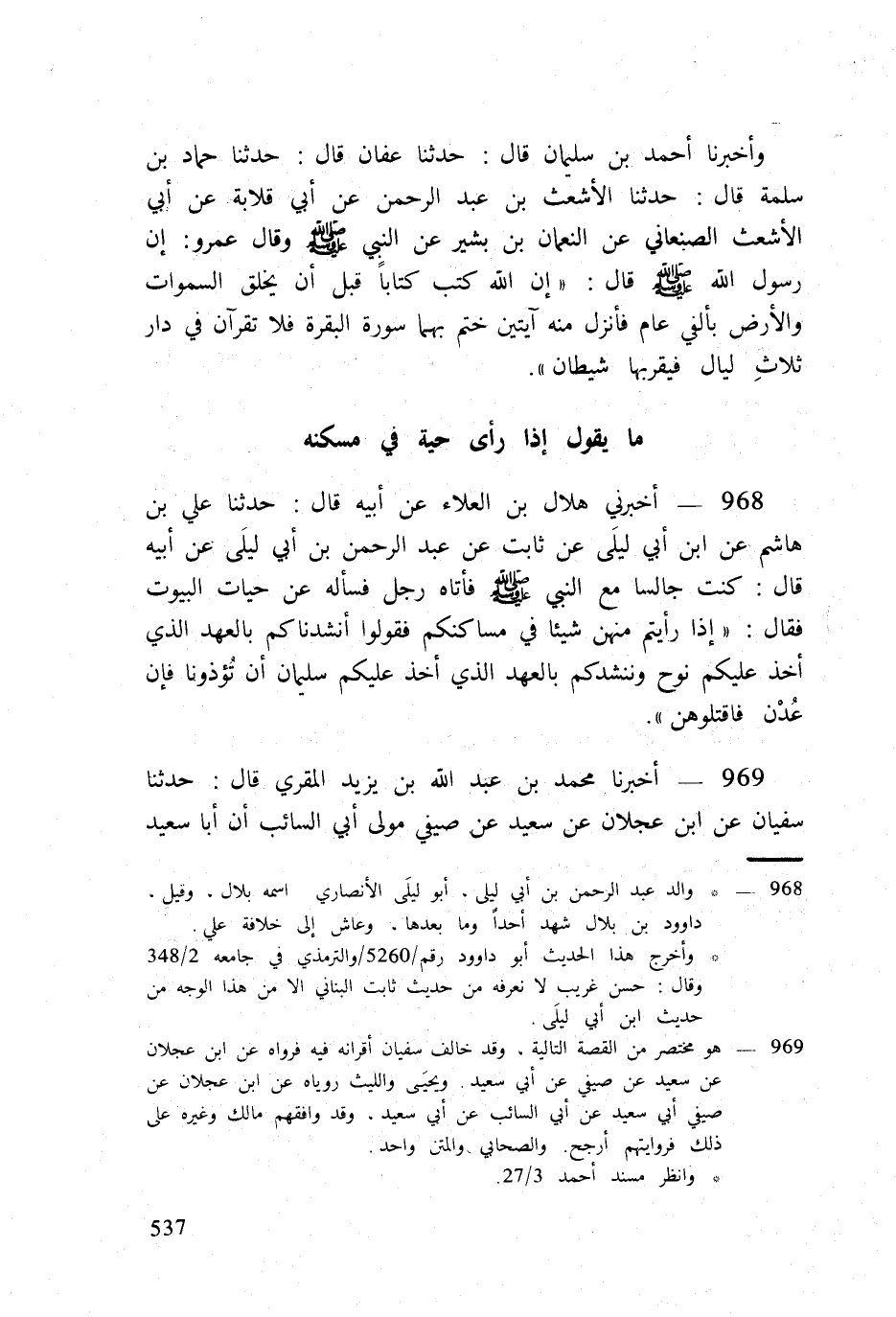 968 - أَخْبرنِي هِلَال بن الْعَلَاء عَن أَبِيه قَالَ حَدثنَا عَليّ بن هَاشم عَن ابْن أبي ليلى عَن ثَابت عَن عبد الرَّحْمَن بن أبي ليلى عَن أَبِيه قَالَ كنت جَالِسا مَعَ النَّبِي صلى الله عَلَيْهِ وَسلم فَأَتَاهُ رجل فَسَأَلَهُ عَن حيات الْبيُوت فَقَالَ