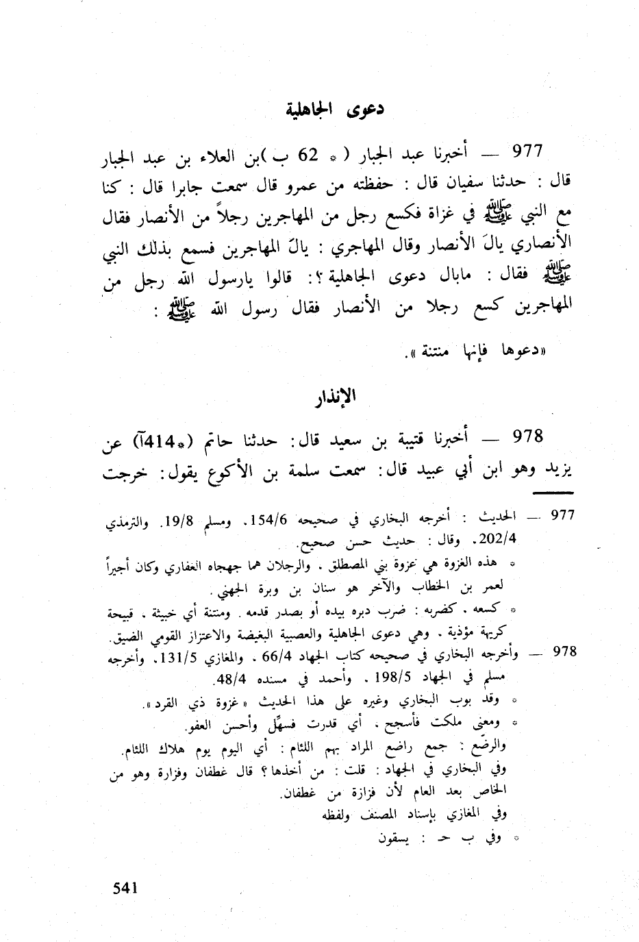 977 - أخبرنَا عبد الْجَبَّار (62 ب) بن الْعَلَاء بن عبد الْجَبَّار قَالَ حَدثنَا سُفْيَان قَالَ حفظته من عَمْرو قَالَ سَمِعت جَابِرا قَالَ كُنَّا مَعَ النَّبِي صلى الله عَلَيْهِ وَسلم فِي غزَاة فَكَسَعَ رجل من الْمُهَاجِرين رجلا من الْأَنْصَار فَقَالَ الْأنْصَارِيّ يالَ الْأَنْصَار وَقَالَ الْمُهَاجِرِي يالَ الْمُهَاجِرين فَسمع بذلك النَّبِي صلى الله عَلَيْهِ وَسلم فَقَالَ