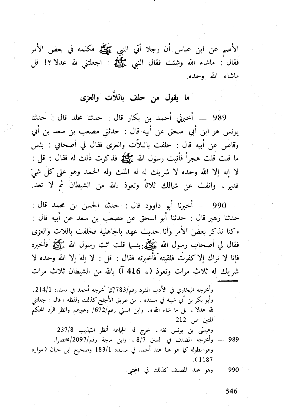 990 - أخبرنَا أَبُو دَاوُود قَالَ حَدثنَا الْحسن بن مُحَمَّد قَالَ حَدثنَا زُهَيْر قَالَ حَدثنَا أَبُو اسحق عَن مُصعب بن سعد عَن أَبِيه قَالَ كُنَّا نذْكر بعض الْأَمر وَأَنا حَدِيث عهد بالجاهلية فَحَلَفت بِاللات والعزى فَقَالَ لي أَصْحَاب رَسُول الله صلى الله عَلَيْهِ وَسلم بئْسَمَا قلت ائْتِ رَسُول الله صلى الله عَلَيْهِ وَسلم فَأخْبرهُ فَإنَّا لَا نرَاك إِلَّا كفرت فَلَقِيته فَأَخْبَرته فَقَالَ