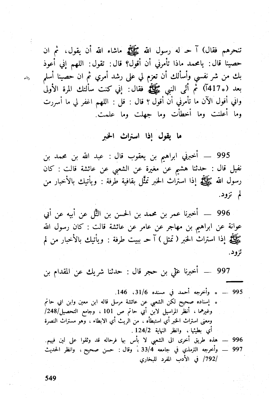 995 - أَخْبرنِي ابراهيم بن يَعْقُوب قَالَ عبد الله بن مُحَمَّد بن نفَيْل قَالَ حَدثنَا هشيم عَن مغيره عَن الشّعبِيّ عَن عَائِشَة قَالَت كَانَ رَسُول الله صلى الله عَلَيْهِ وَسلم إِذا استراث الْخَبَر تمثل بقافية طرفَة ويأتيك بالأخبار من لم تزَود